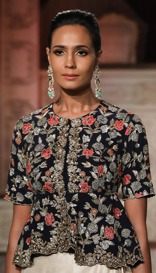 A Midnight Blue Matka Silk Overlap Sangeet Jacket