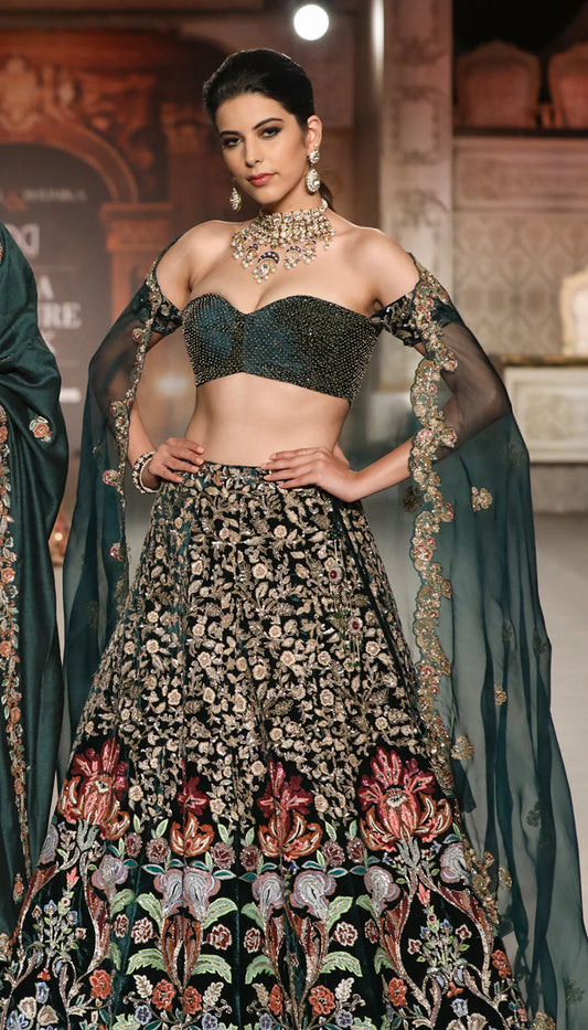 A Midnight Blue Raw Silk Lehenga Inspired by Classic Mogul Florals