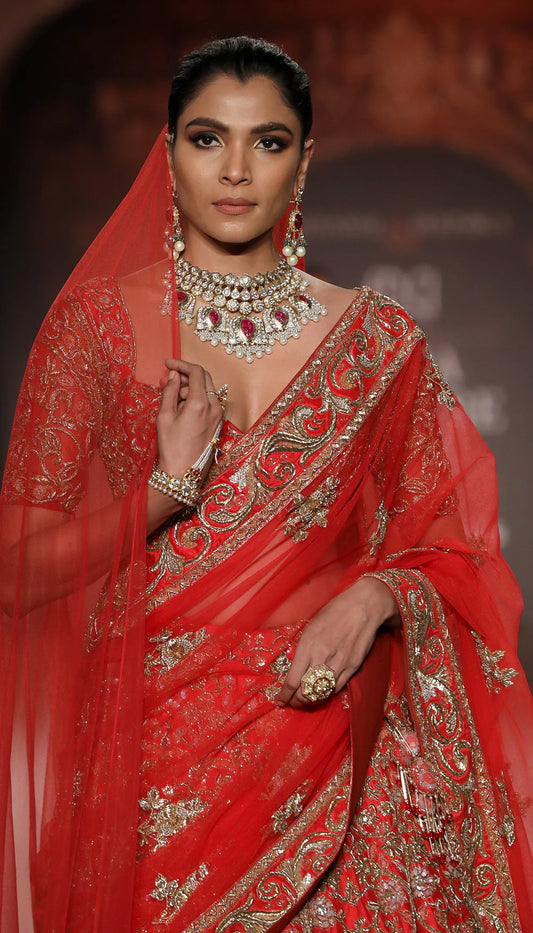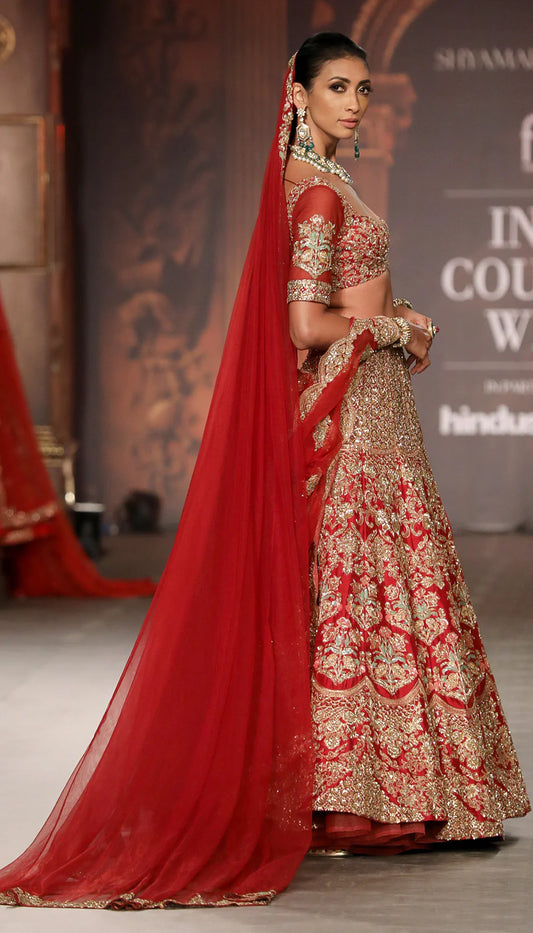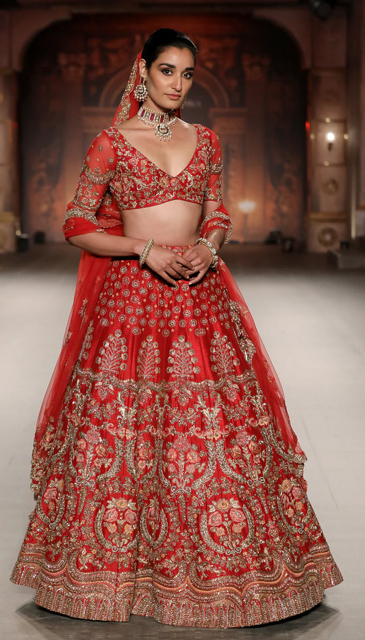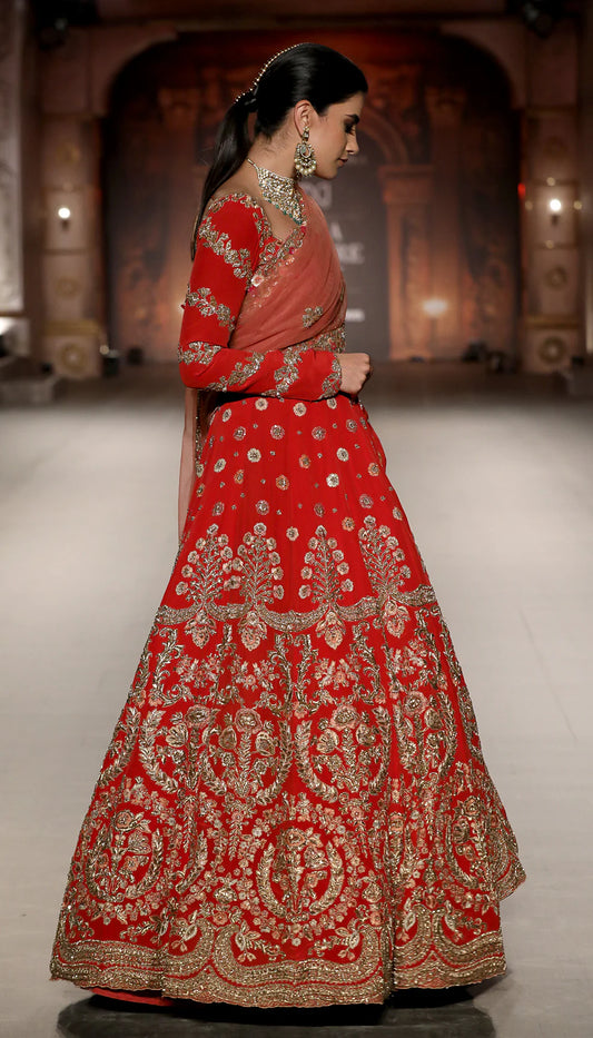 A Fiery Red Crepe Silk Bridal Kalidaar Gown