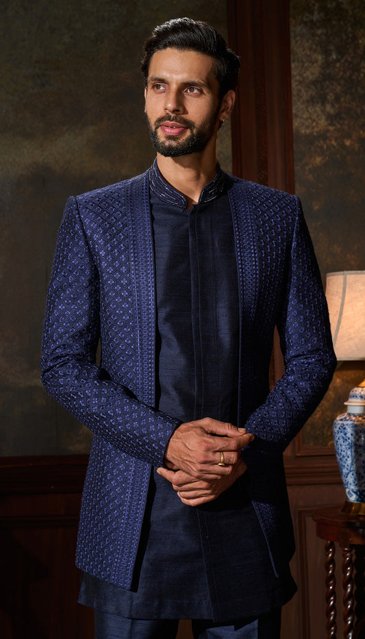 A Midnight Blue Matka Silk Overlap Sangeet Jacket