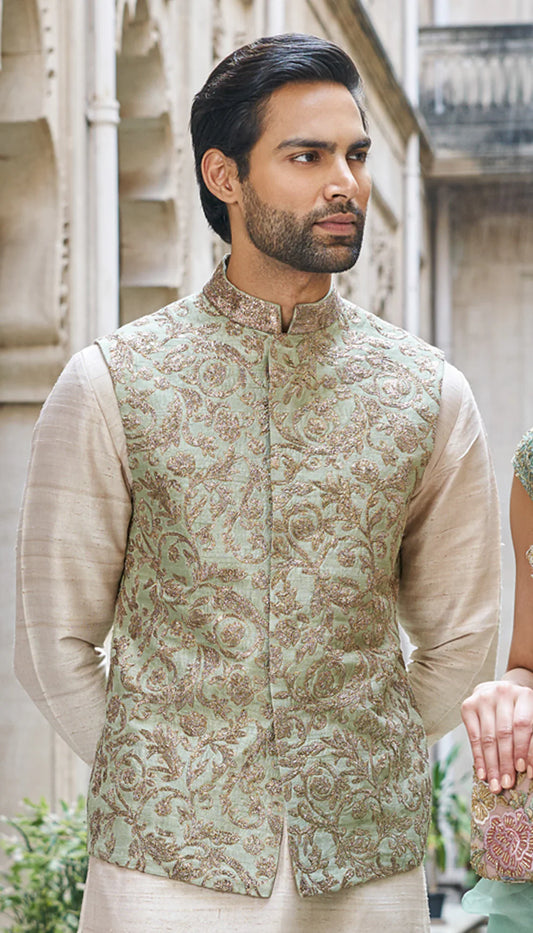 Fennel Green Raw Silk Pita Jaal Bundee Over Ivory Matka Silk Kurta