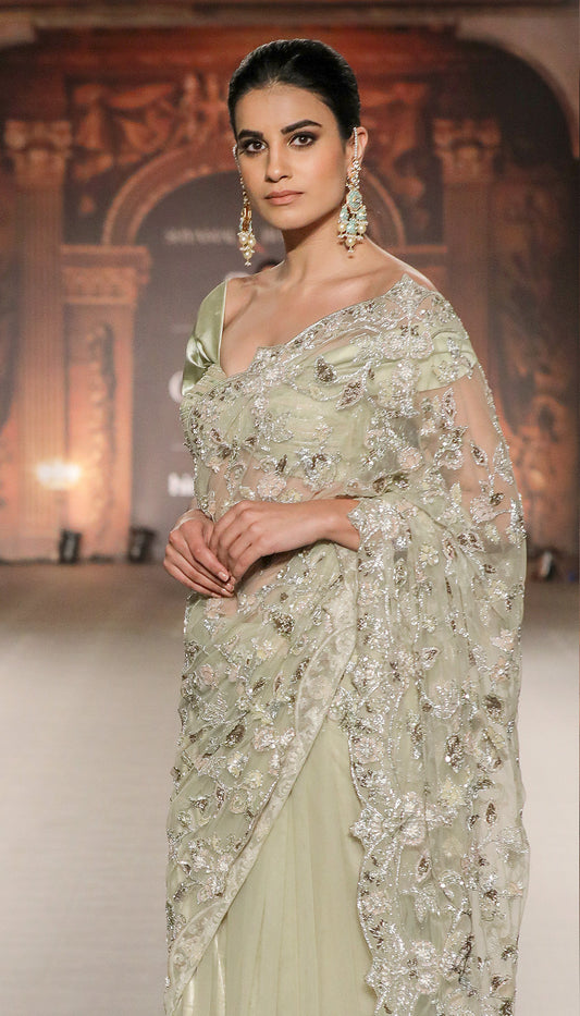 A Mint Scalloped Edge Tulle Saree