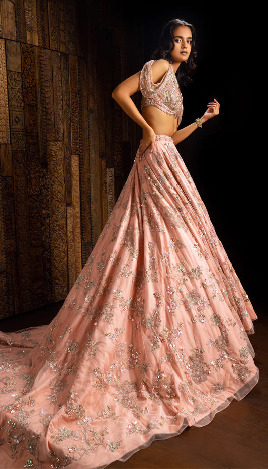 Pale Pink Tulle Lehenga with Floral Appliqué