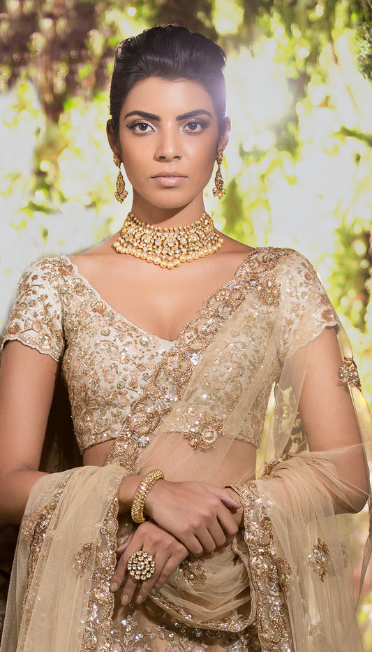 Champagne Raw Silk Panelled Lehenga with Floral Embroidery