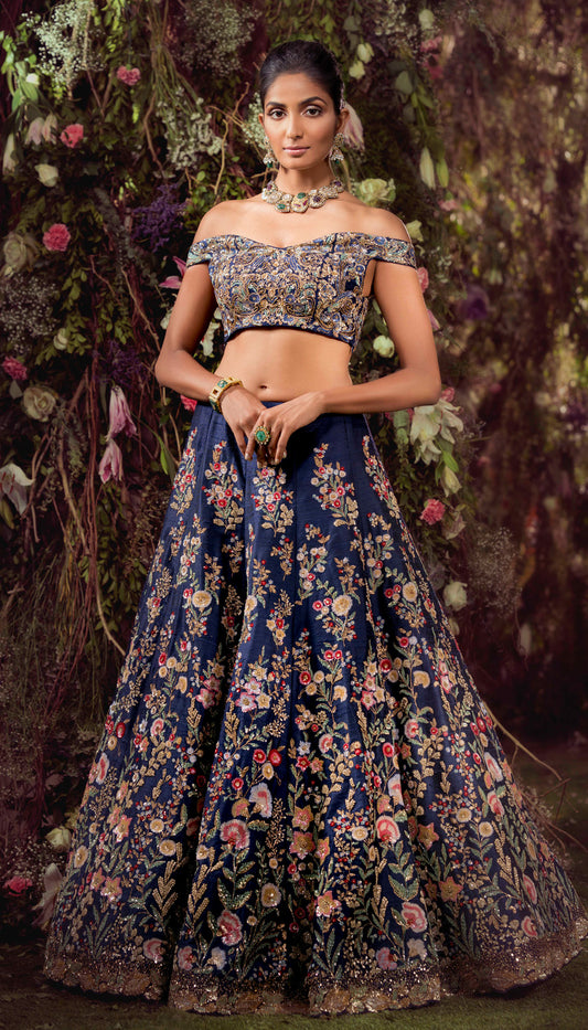 Deep Blue Raw Silk Jacket with Sheer Sleeves and Tulle Lehenga