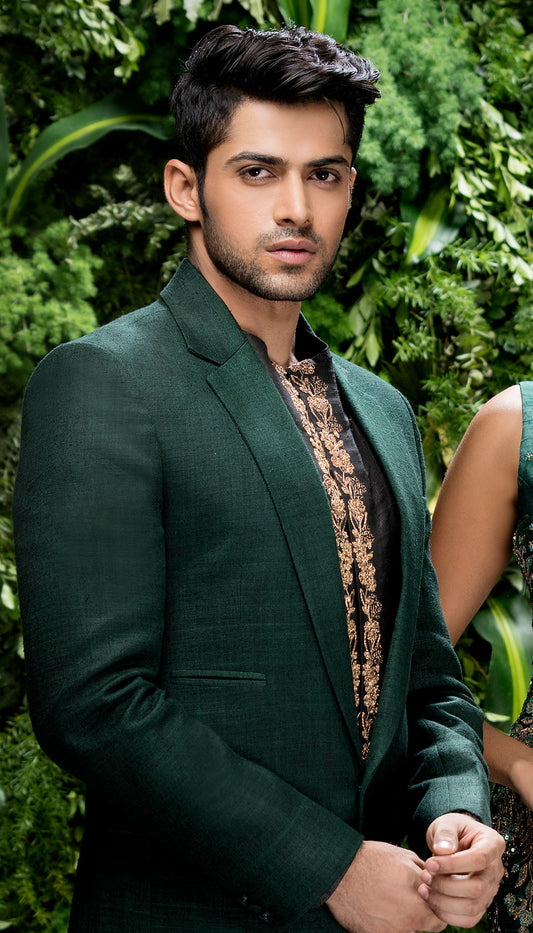 Elegant Green Matka Silk Jacket with Black Raw Silk Shirt