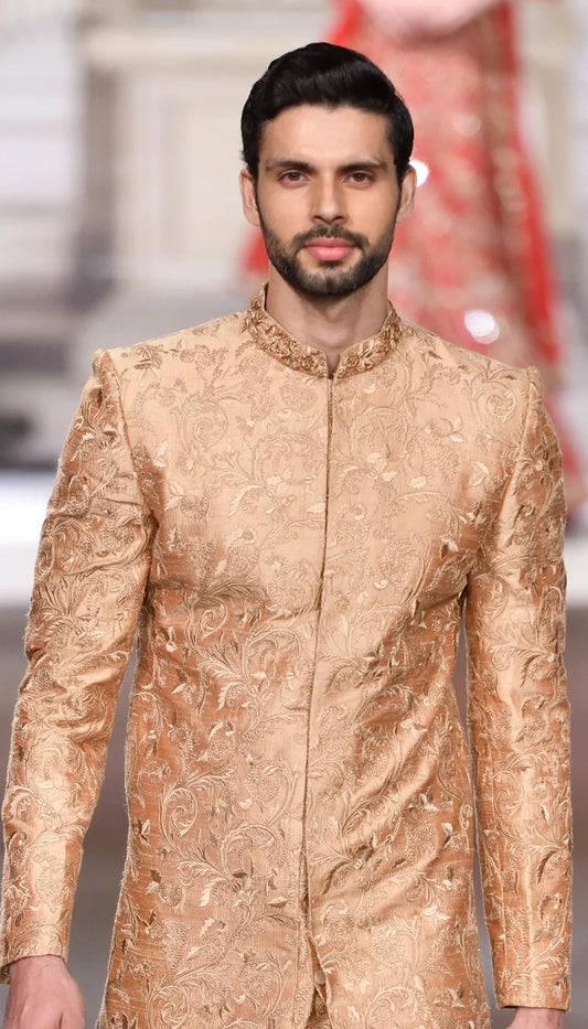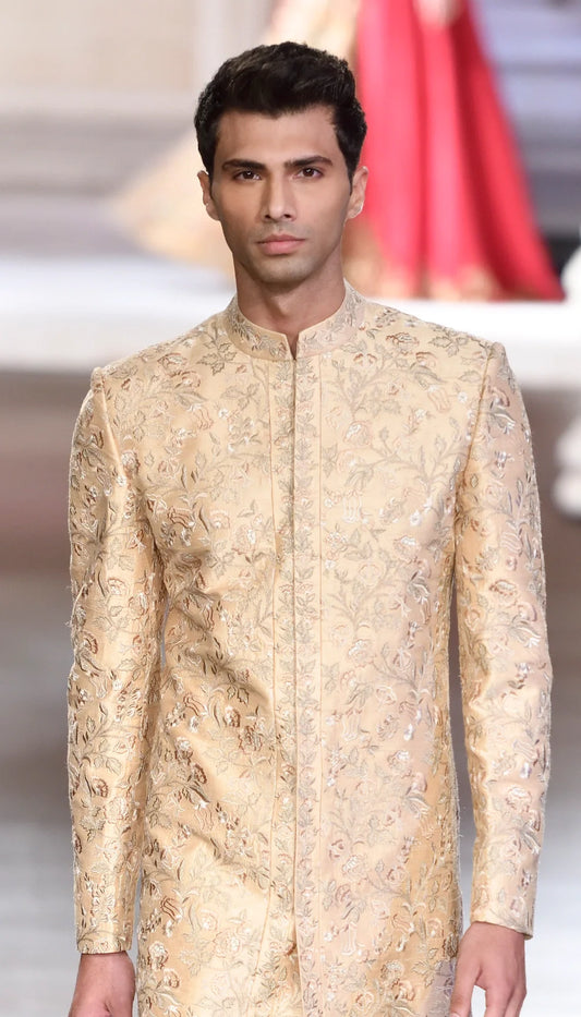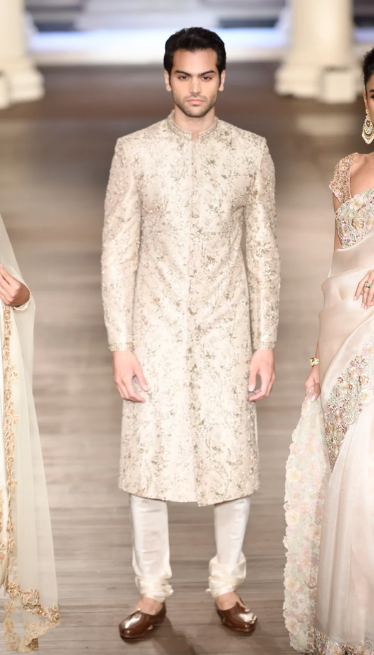 Beige Raw Silk Sherwani with Intricate Floral Thread Embroidery