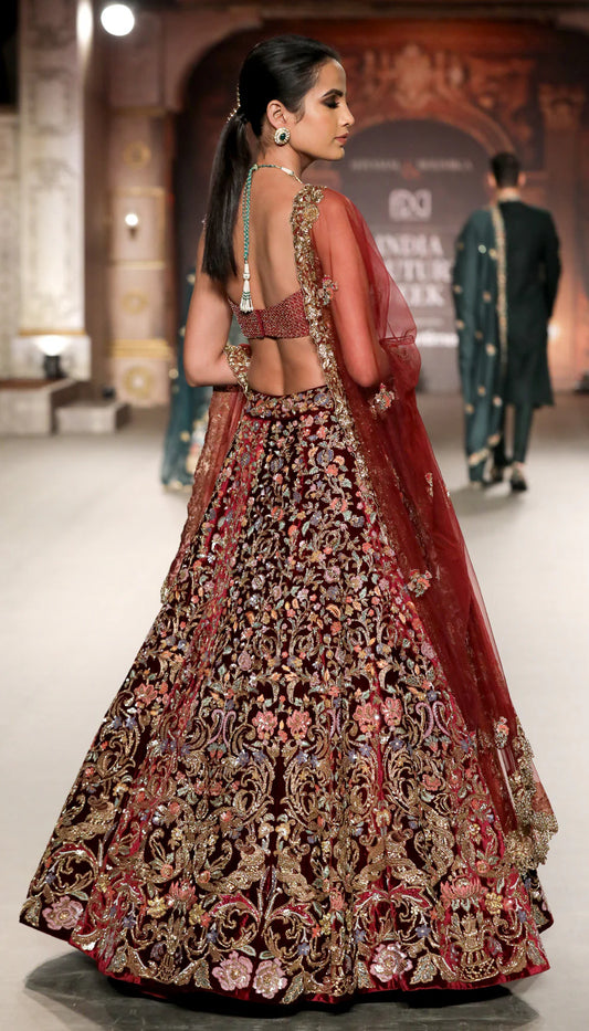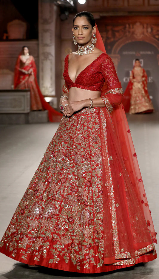 A Fiery Red Crepe Silk Bridal Kalidaar Gown
