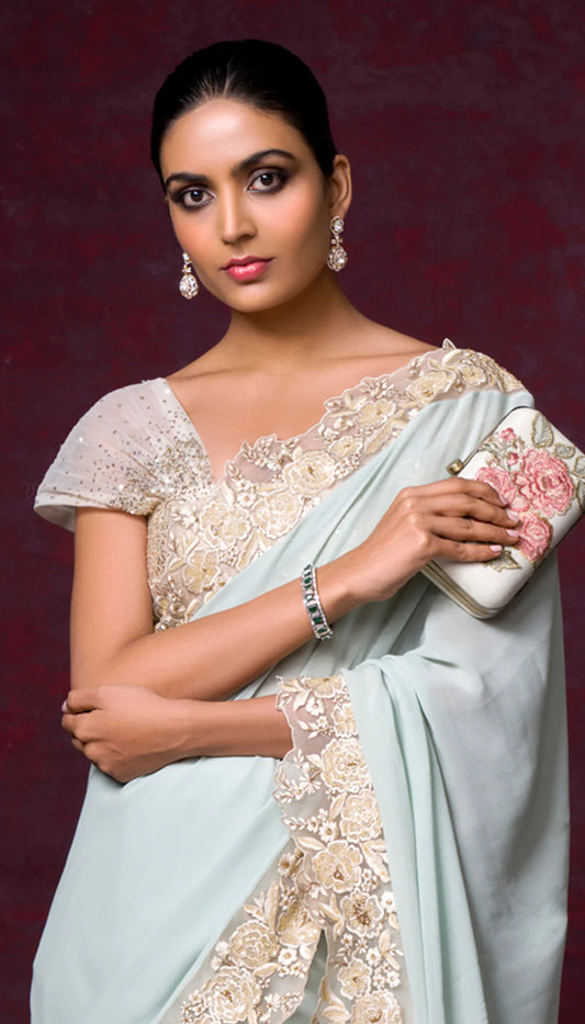 A Perfectly Crafted Powder Blue Crepe Silk Saree