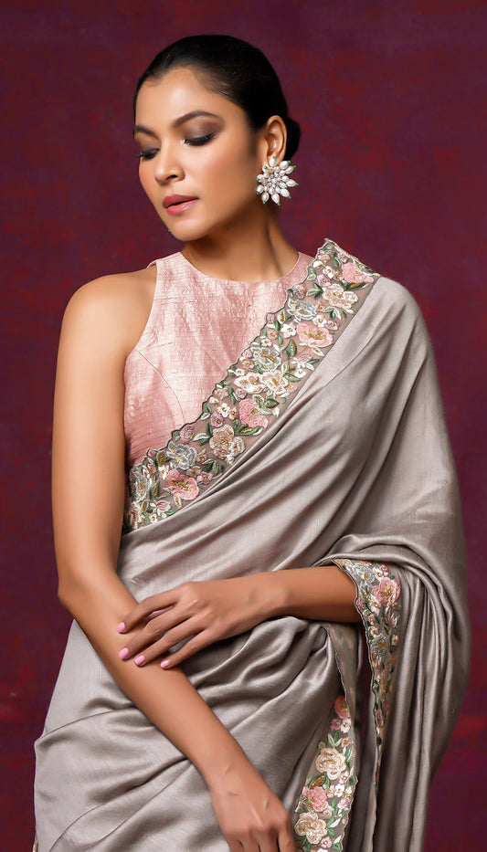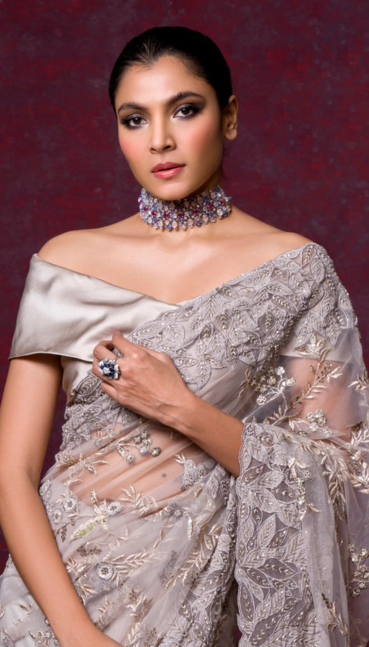 A Mood Grey Tulle Saree with Tonal Thread Work