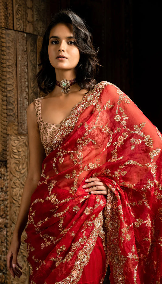 Furthermore, sustainability is at the heart of this collection. By using raw silks, handwoven matka silks, sheer organza, and hand-dyed velvets, the designers ensure an eco-friendly yet luxurious finish. The color palette, featuring flaming red, emerald green, vintage rose, and powder blue, offers versatility for all wedding celebrations.