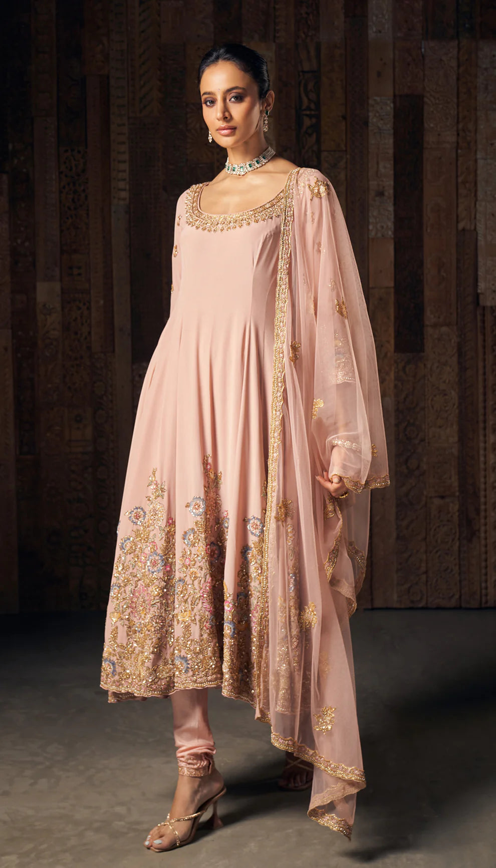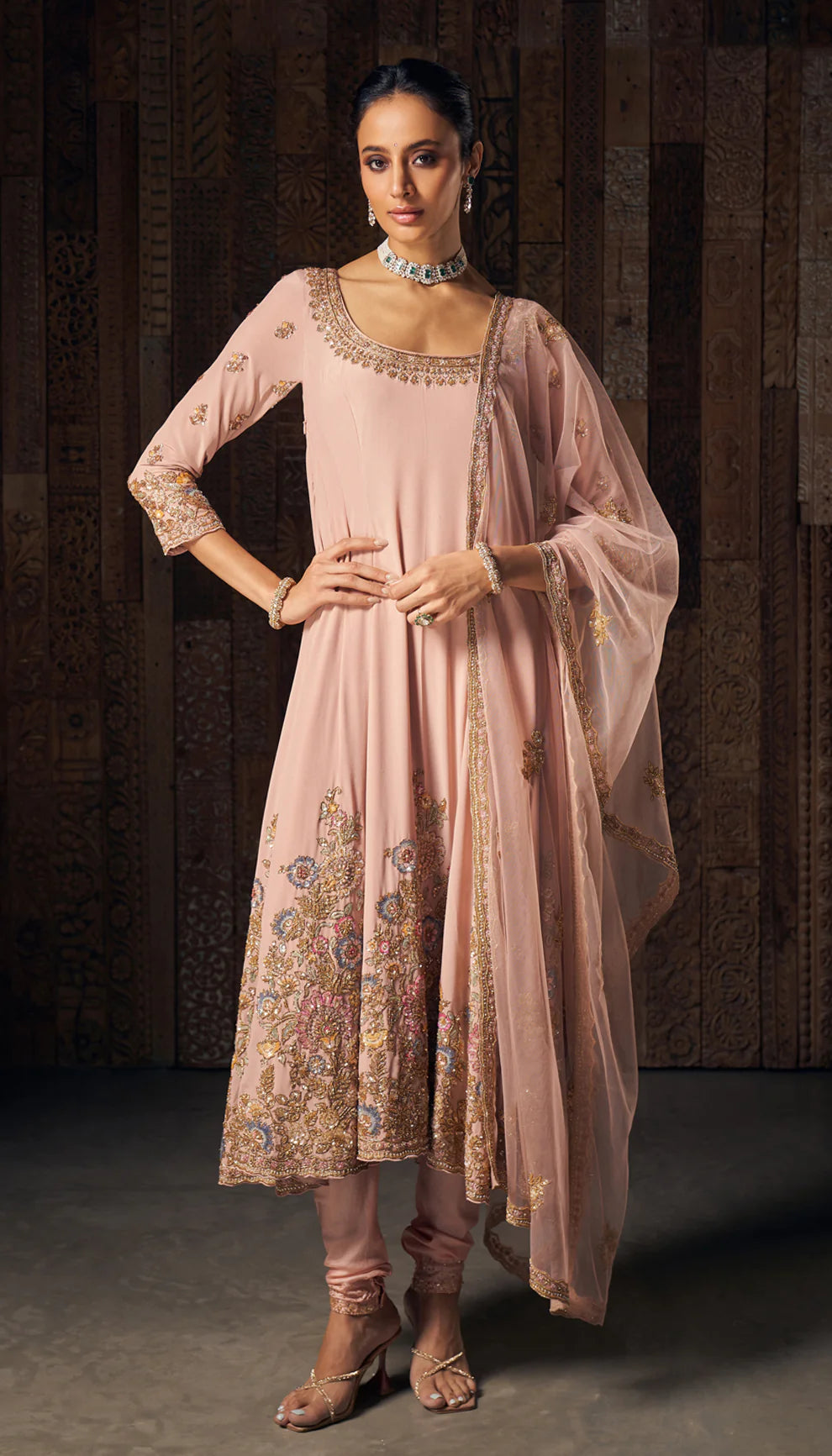 A blush pink crepe silk kalidaar kurta with painterly floral motifs embroidered along the hem in a mix of Peeta, zardozi and aari embroidery. Subtle contrasting sequins, glass beads and resham have been used to created a beautiful painting like effect. This is worn with a silk churidar and tulle dupatta.