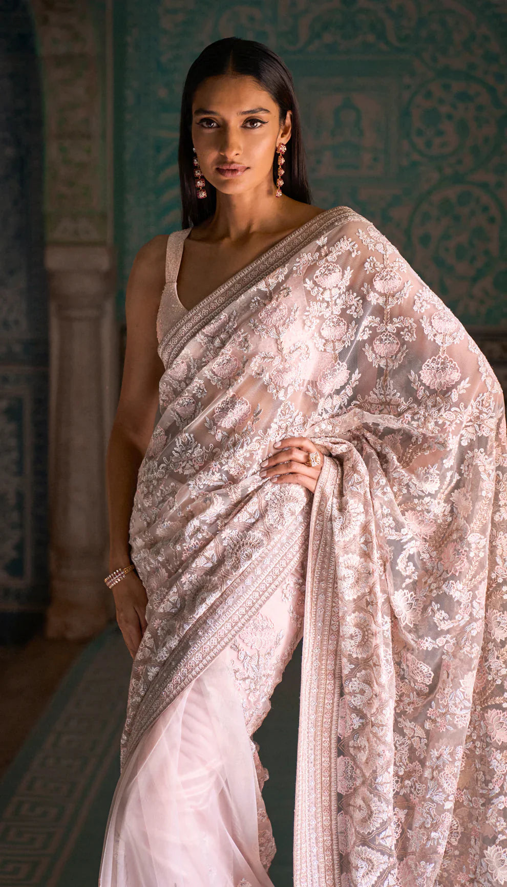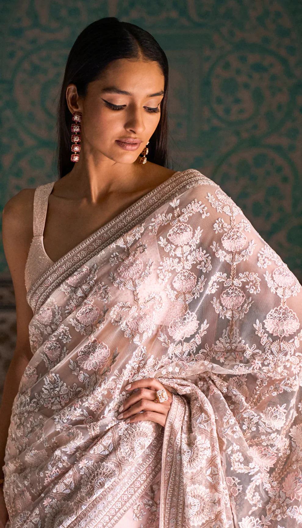 A blush pink hand embroidered tulle saree with lotuses, paired with a crepe silk bustier.