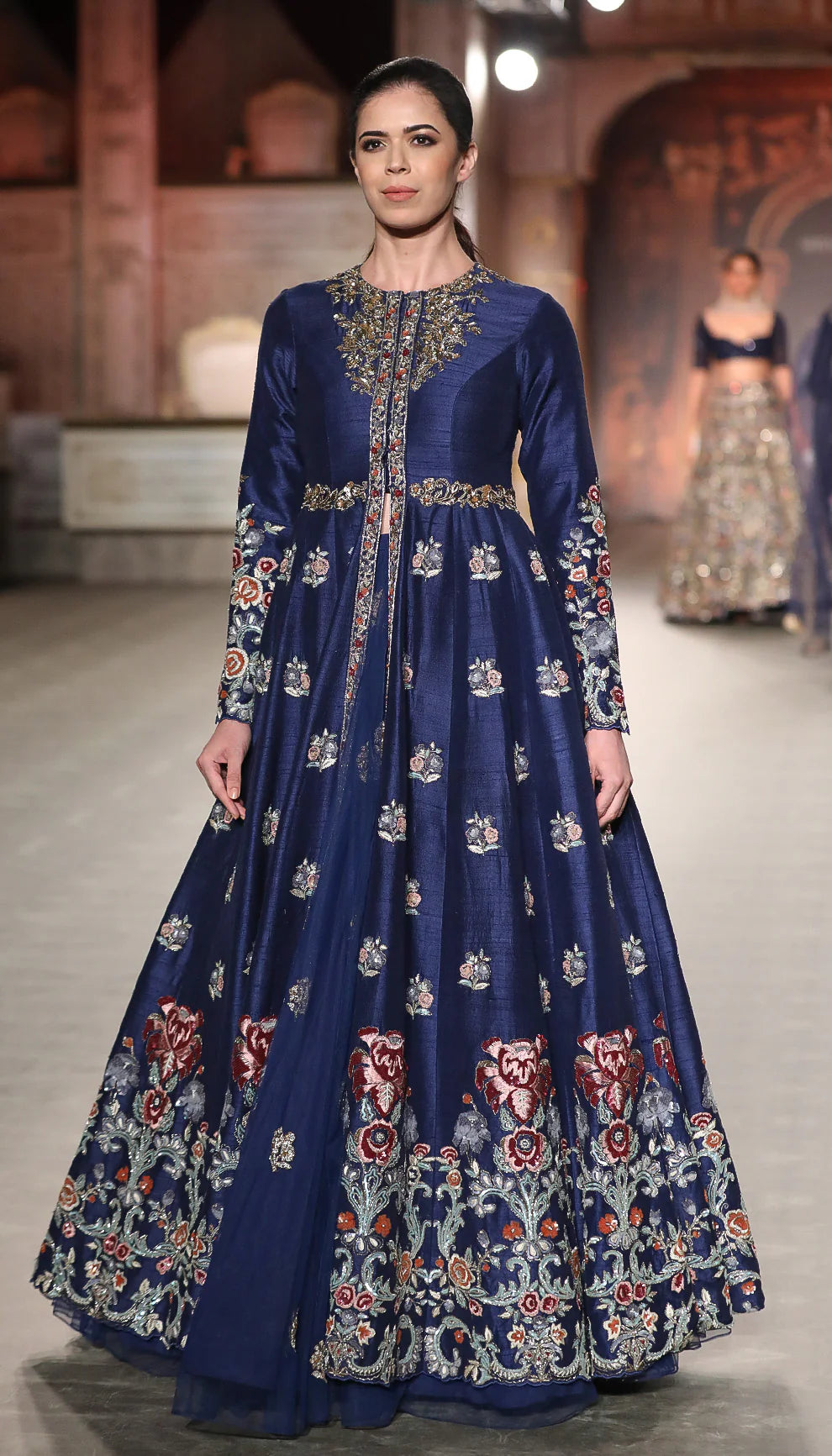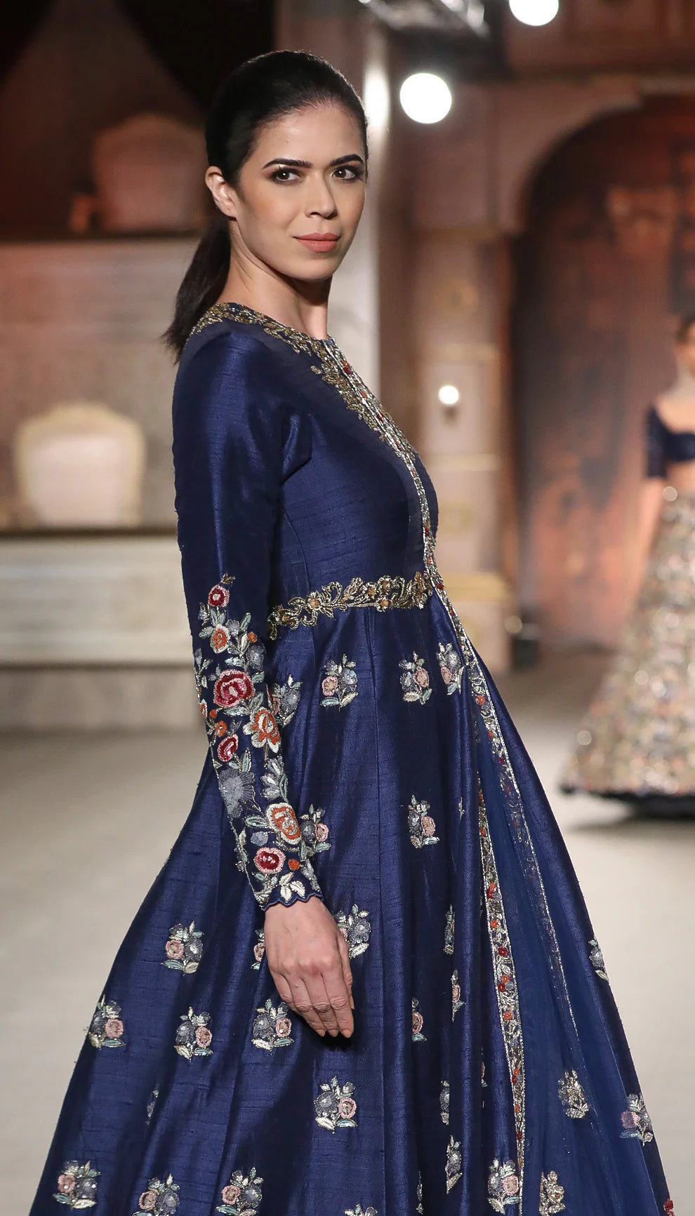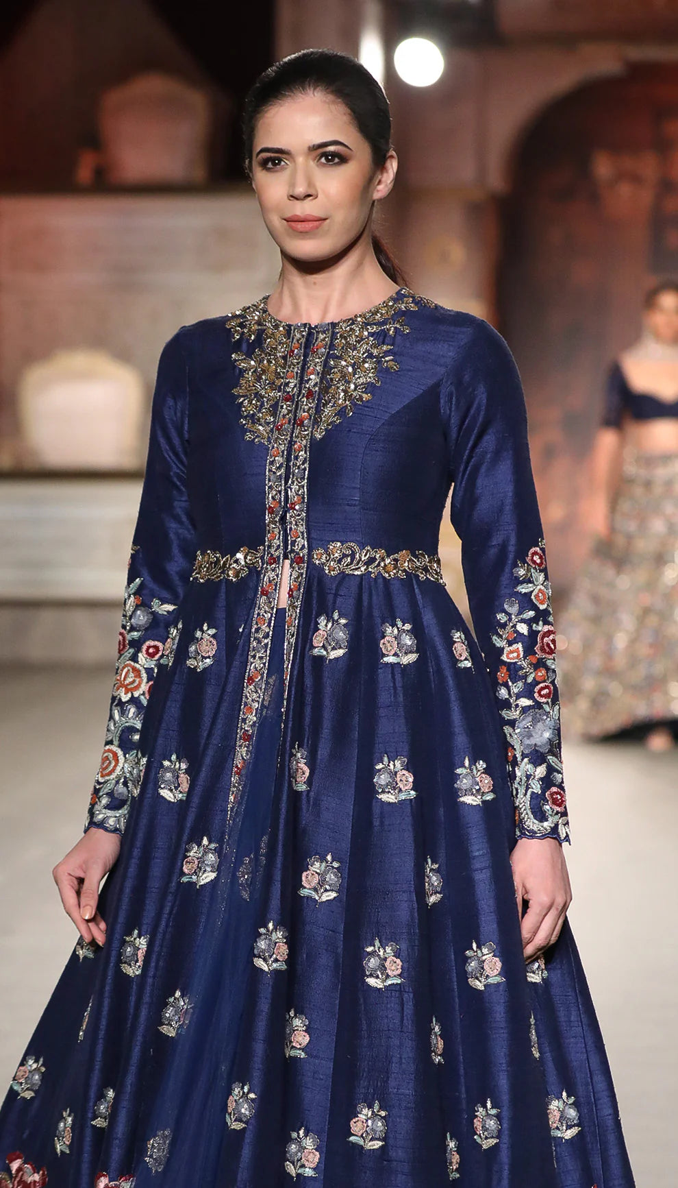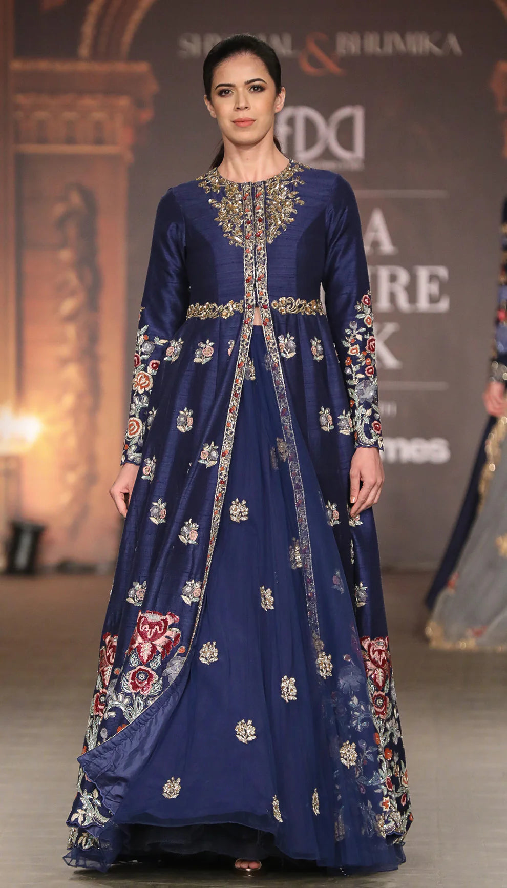 A Classic Muted Royal Blue Panelled Jacket lehenga