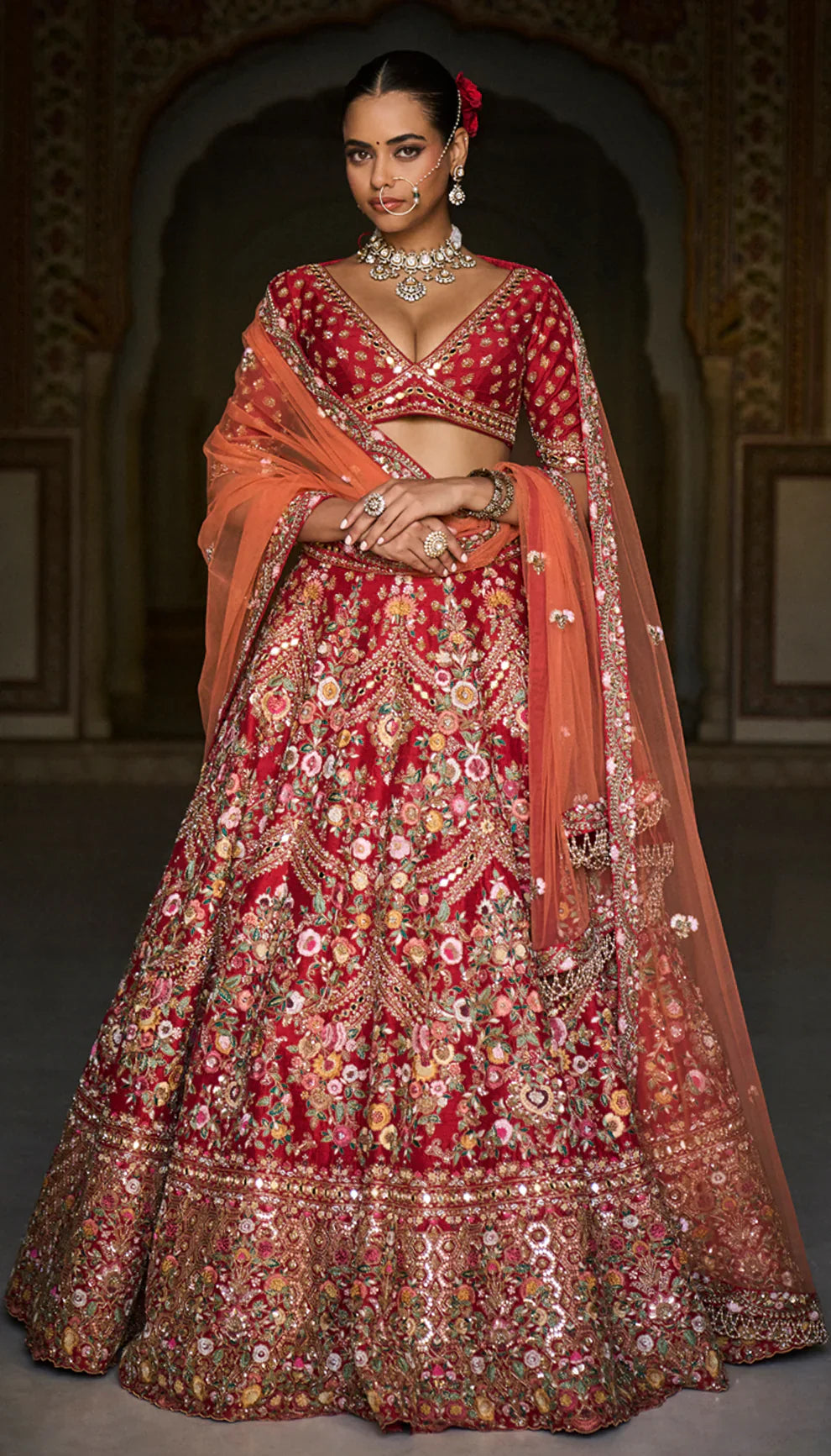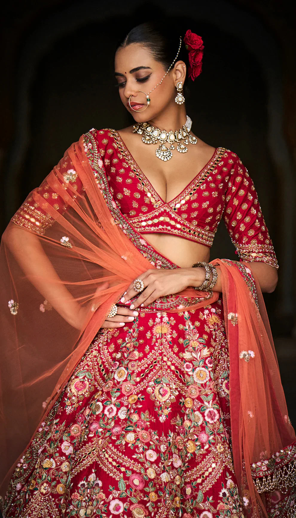 A crimson red raw silk lehenga embroidered with antique gold and mirror