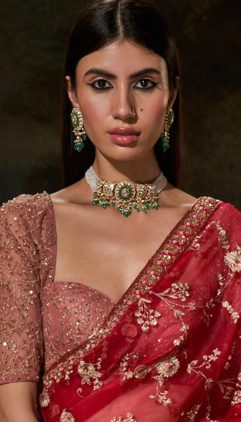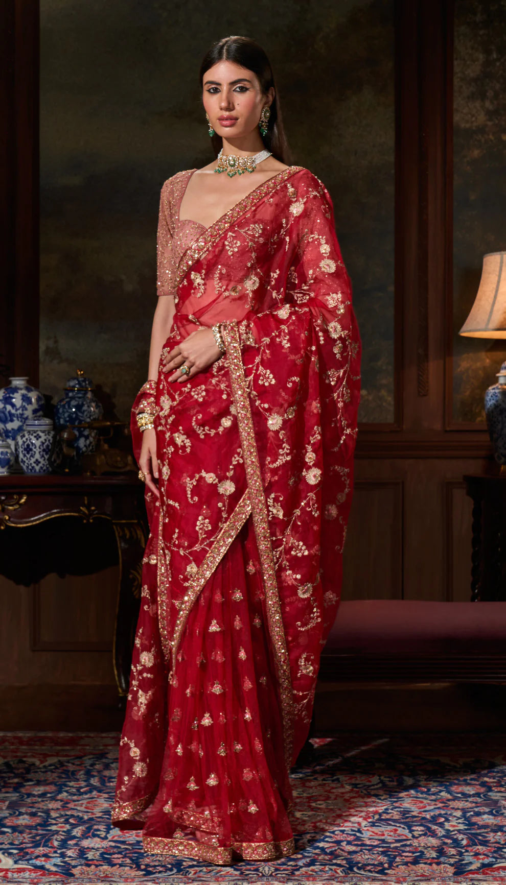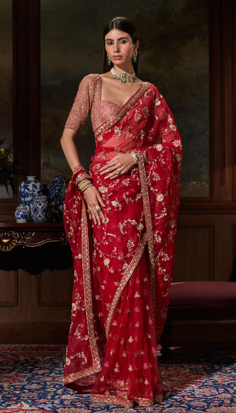 A crimson red silk organza sari with delicate antique gold embroidery. This is teamed with a