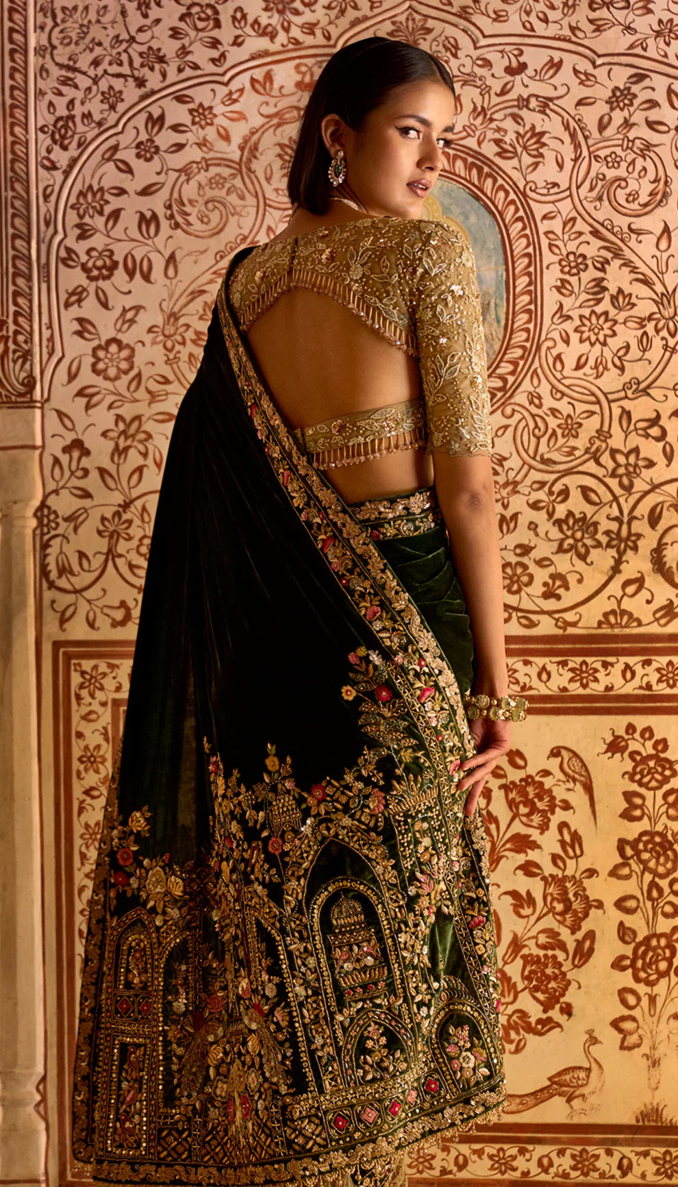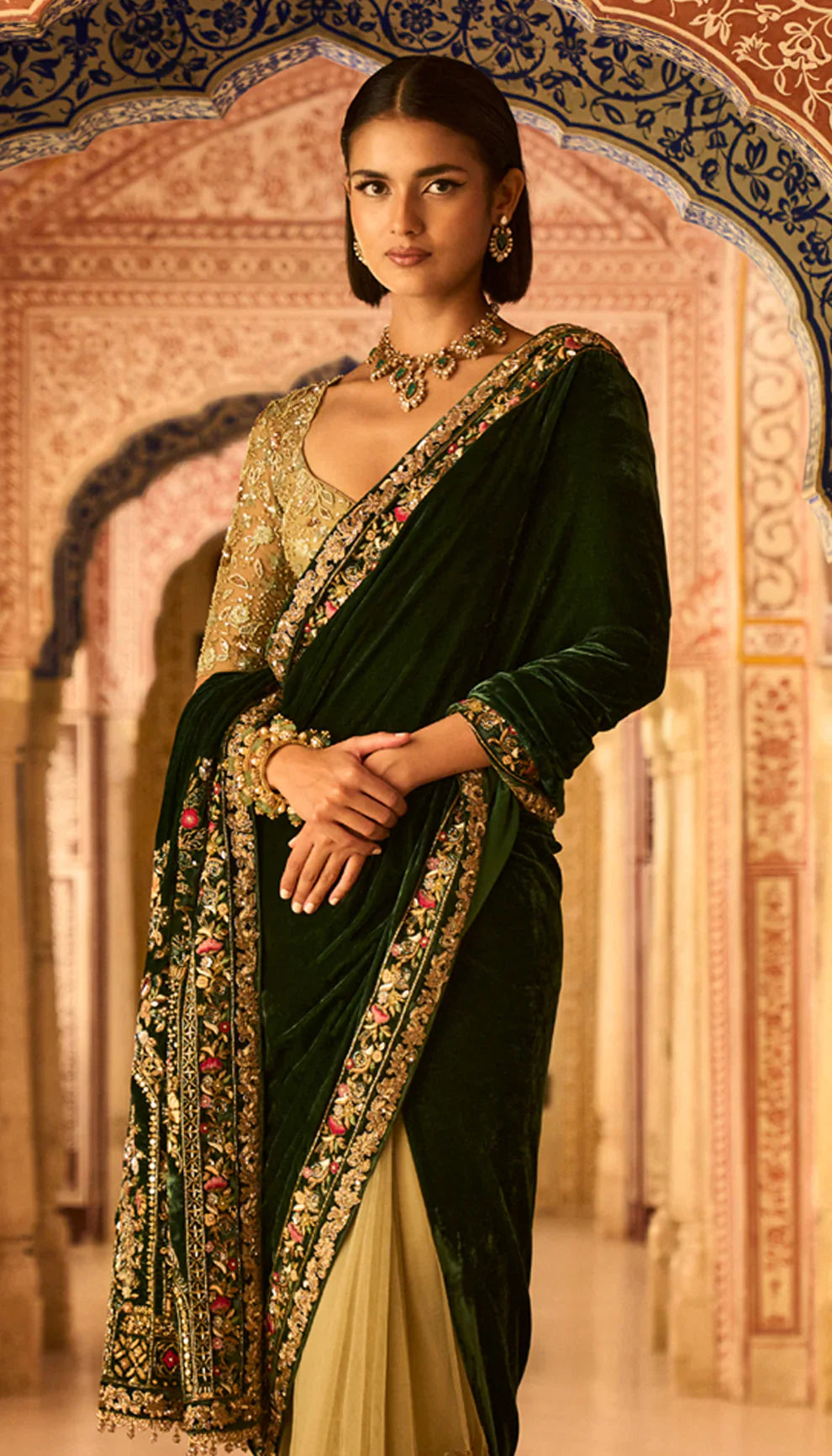 A dark green hand embroidered velvet saree paired with tulle blouse.