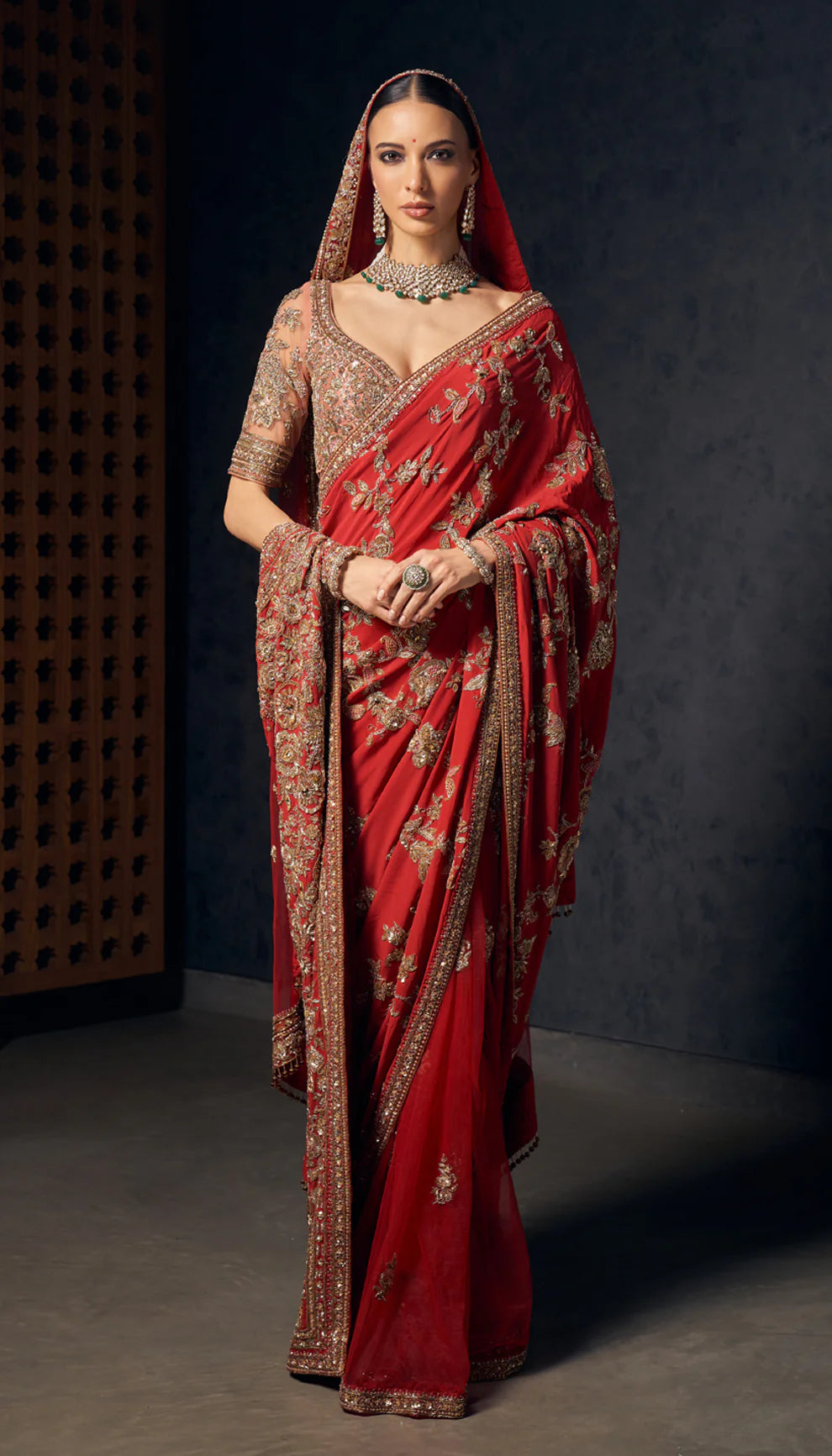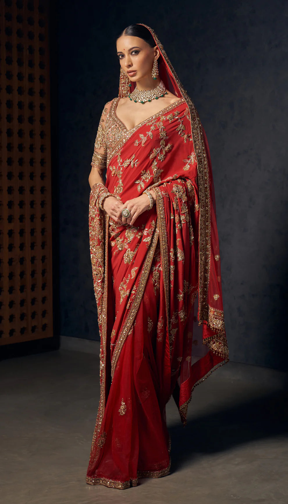 A deep red crepe silk saree showcasing opulent zardozi embroidery, inspired by the intricate carvings of the havelis of Gujarat. The floral pattern is delicately embroidered in antique gold zari, and highlighted with luminous crystals and sequins. This is worn with a heavily embellished intense pink tulle choli.