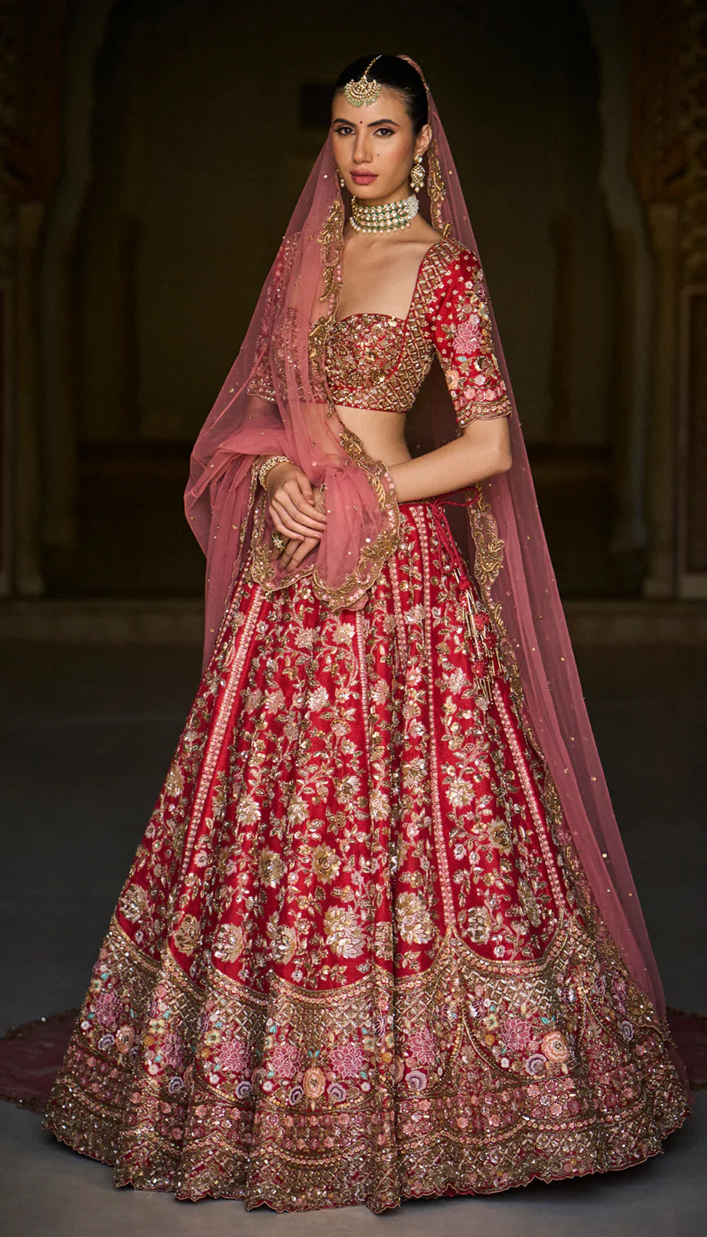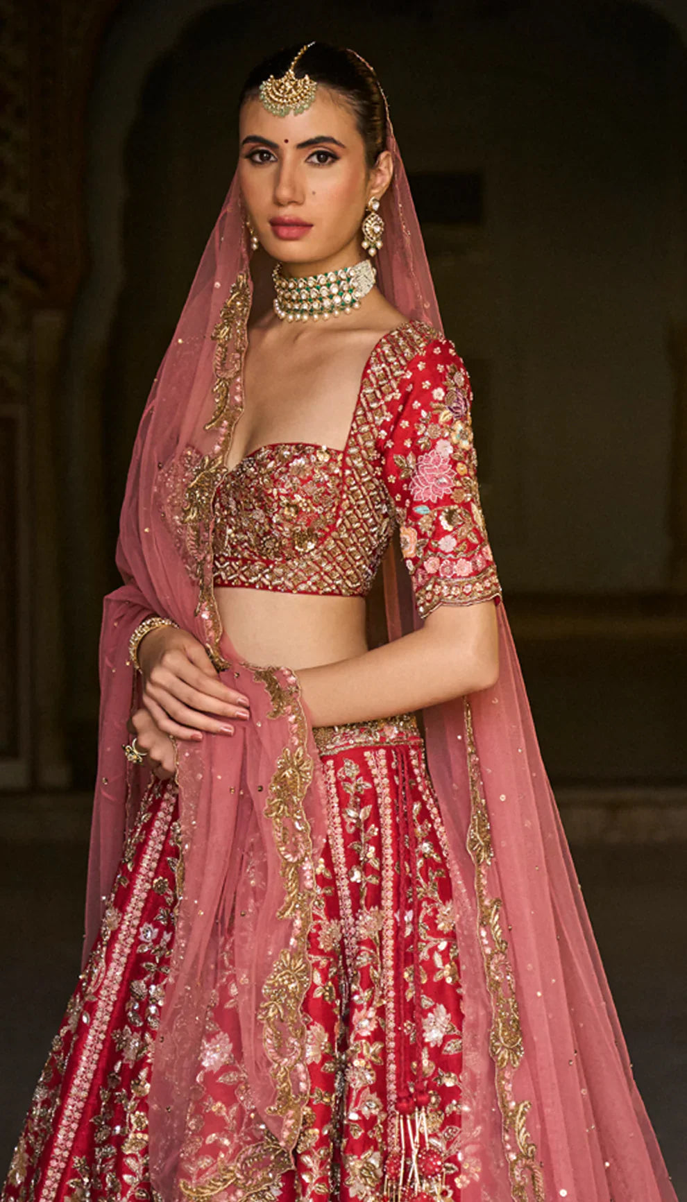 A fiery red lehenga with elaborate ‘pichwai inspired’ embroidery. This is teamed with a raw silk choli and dupatta.