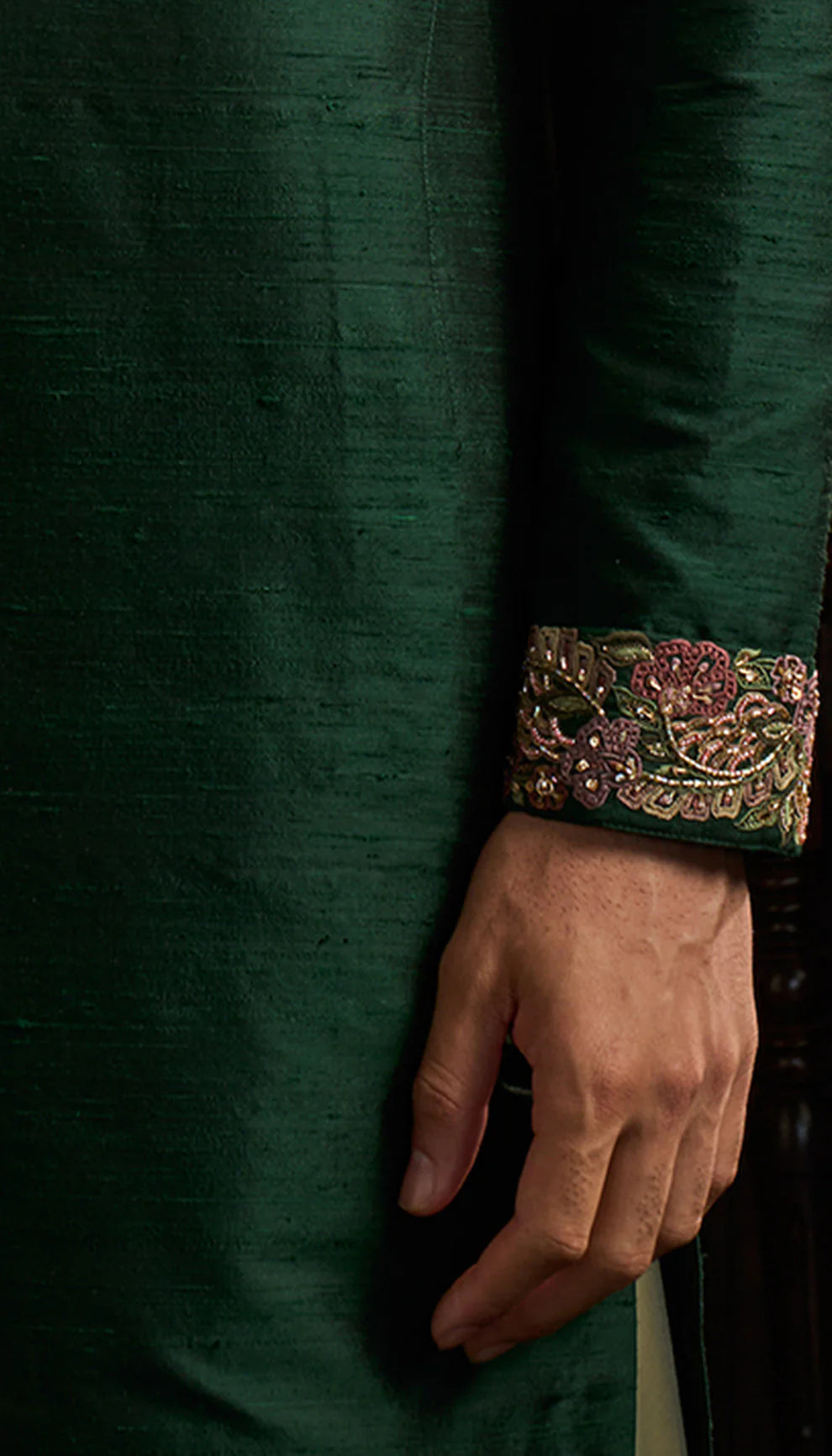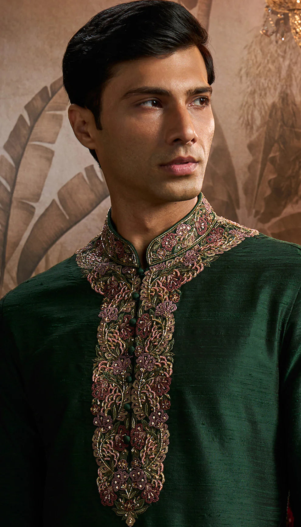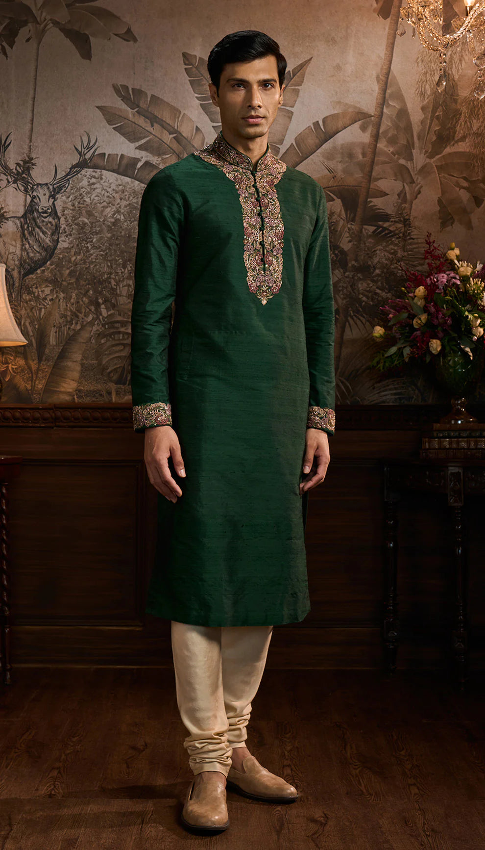 A matka silk kurta with contrast resham and antique gold embroidery.