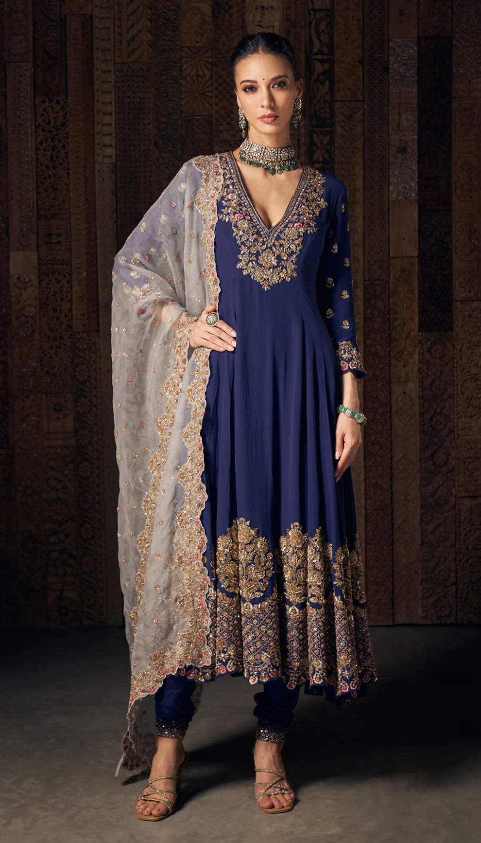 A midnight blue crepe silk kalidar kurta with intricate vintage gold zardozi embroidery placed along the hem of the kalis and an exaggerated V neck. This is worn with a silk churidar and powder blue organza dupatta.