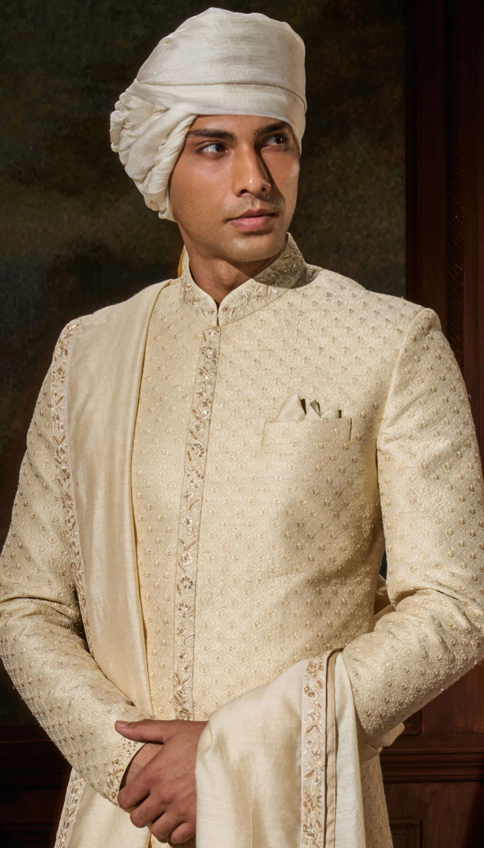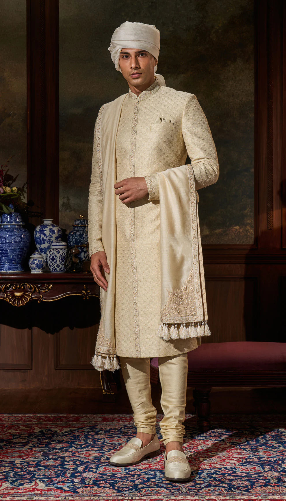 A muted ivory raw silk sherwani with subtle resham embroidery. This is teamed with a