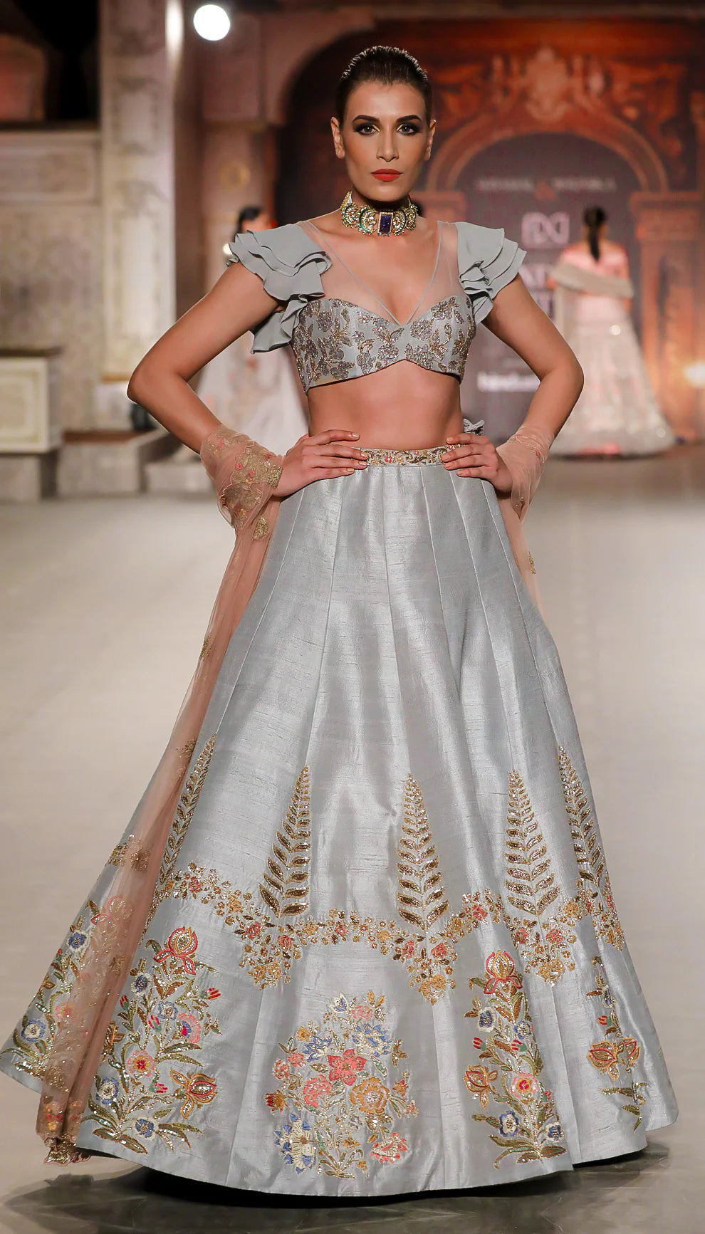 A Painterly Floral Bouquet Pre Wedding Lehenga