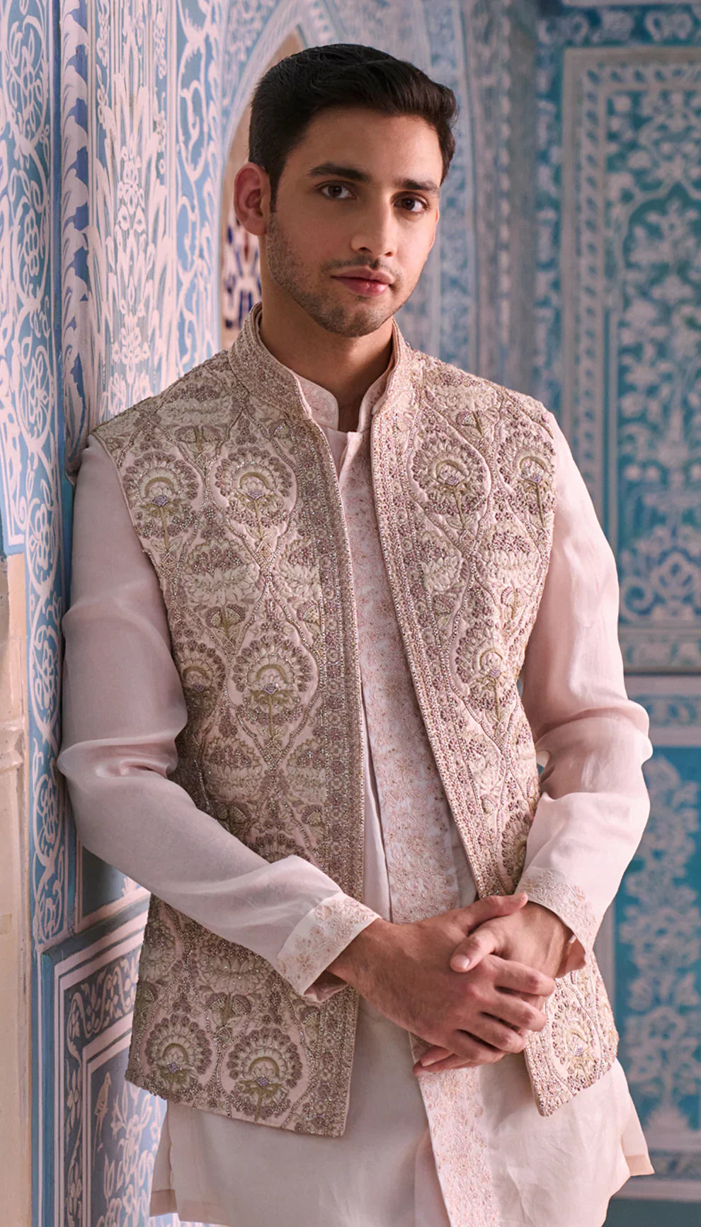 A raw silk pastel pink jacket with intricate silk organza applique and resham embroidery. This is teamed with an organza kurta and matka silk trousers.