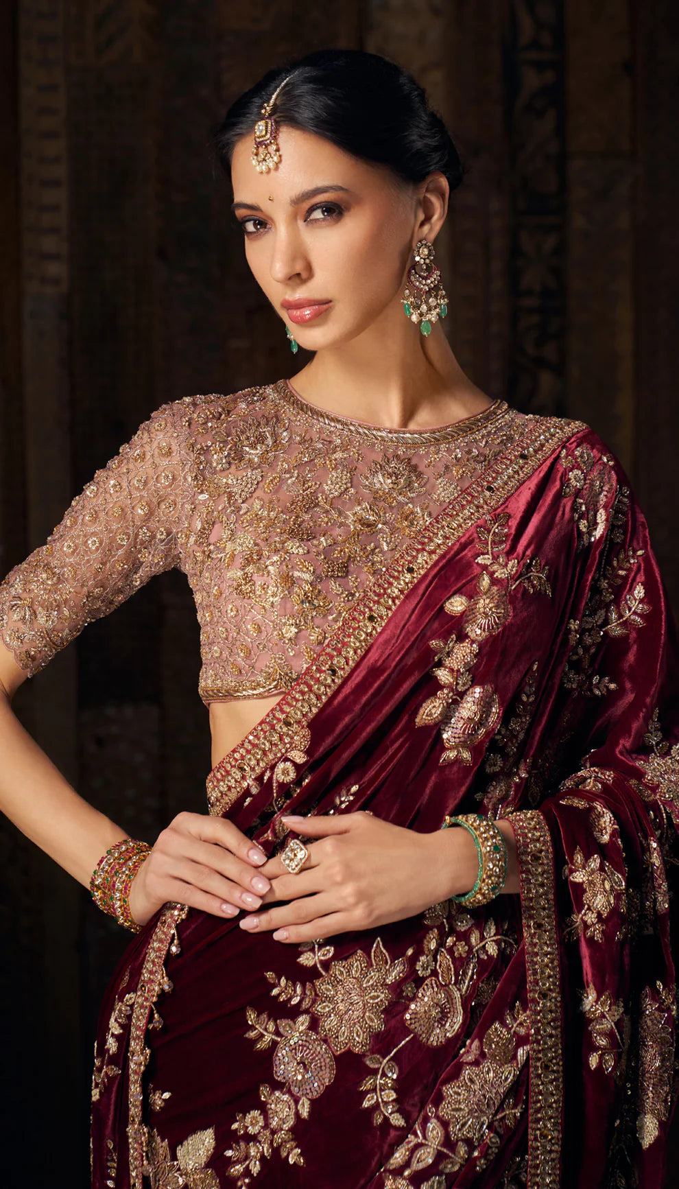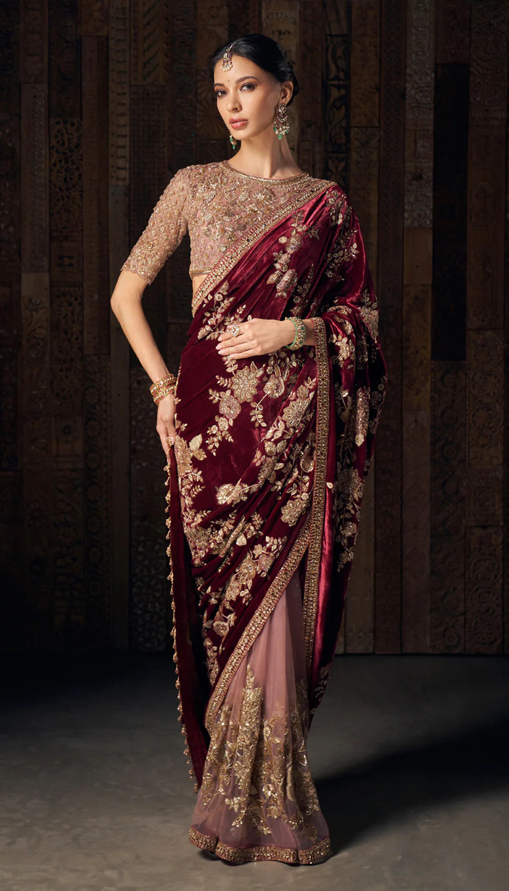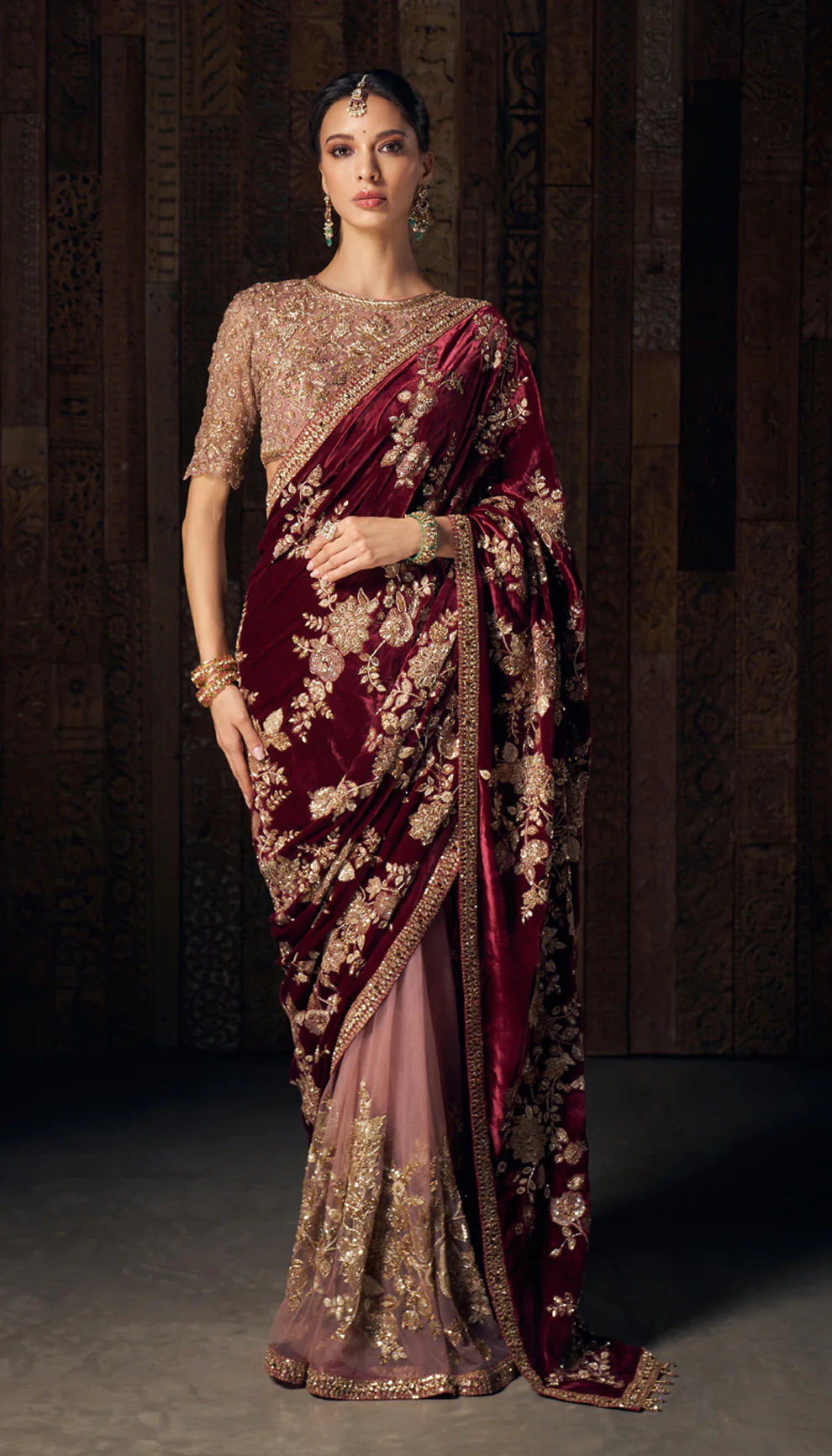 A resplendent wine velvet sari with opulent zardozi and peeta embroidery. Sprawling floral motifs, crafted meticulously in shimmering threads, sequins and zari, exude regal grandeur. This is teamed with a heavily embellished old rose pink tulle blouse.