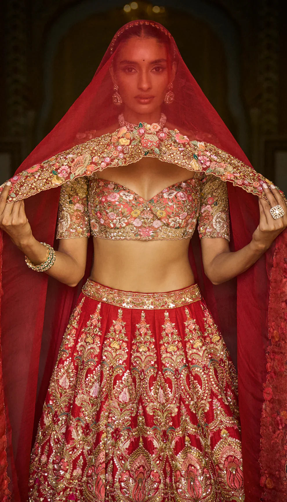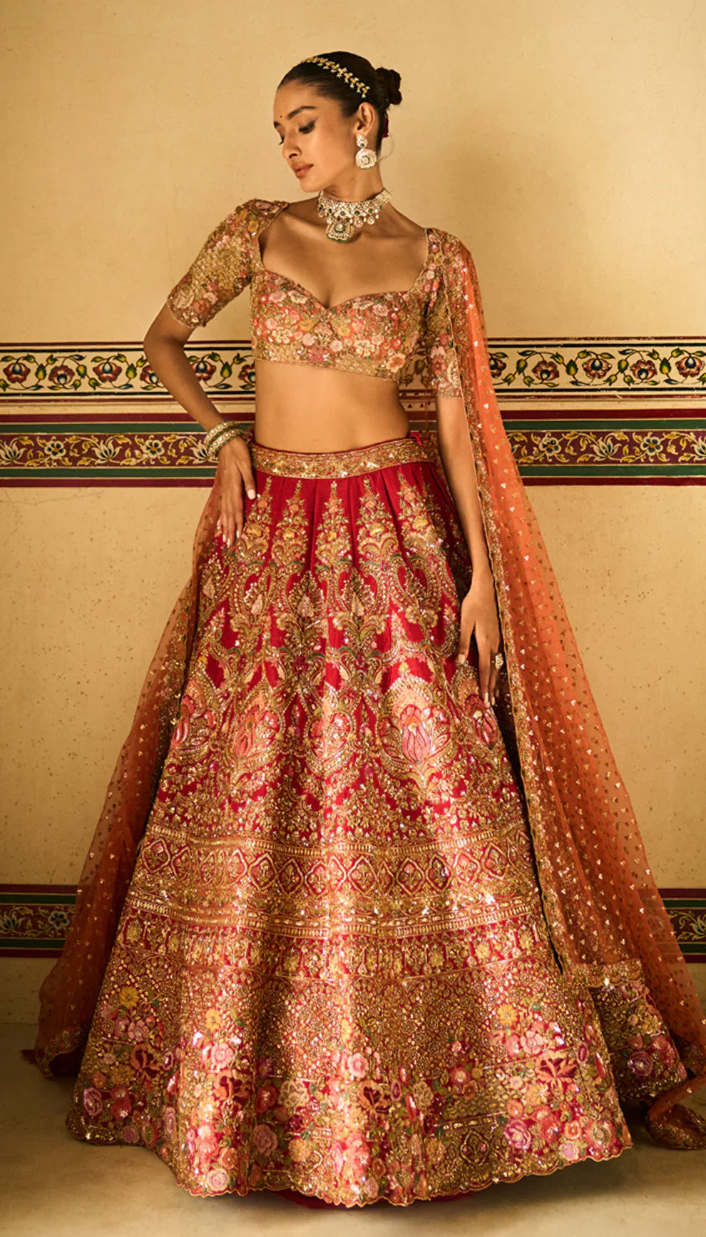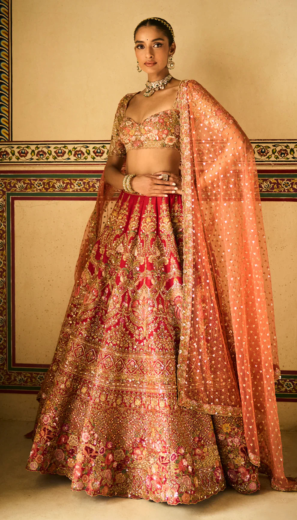 A rose red raw silk lehenga with colorful floral embroidery paired with an intricately embroidered choli and dupatta.