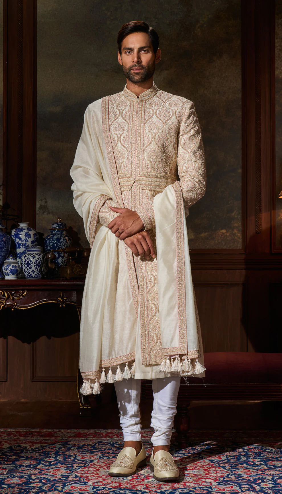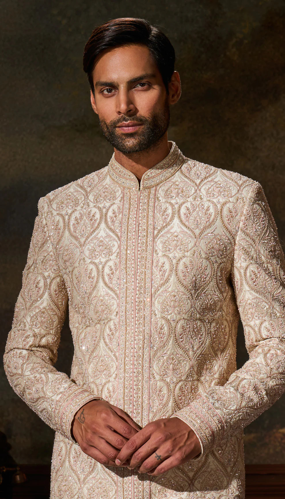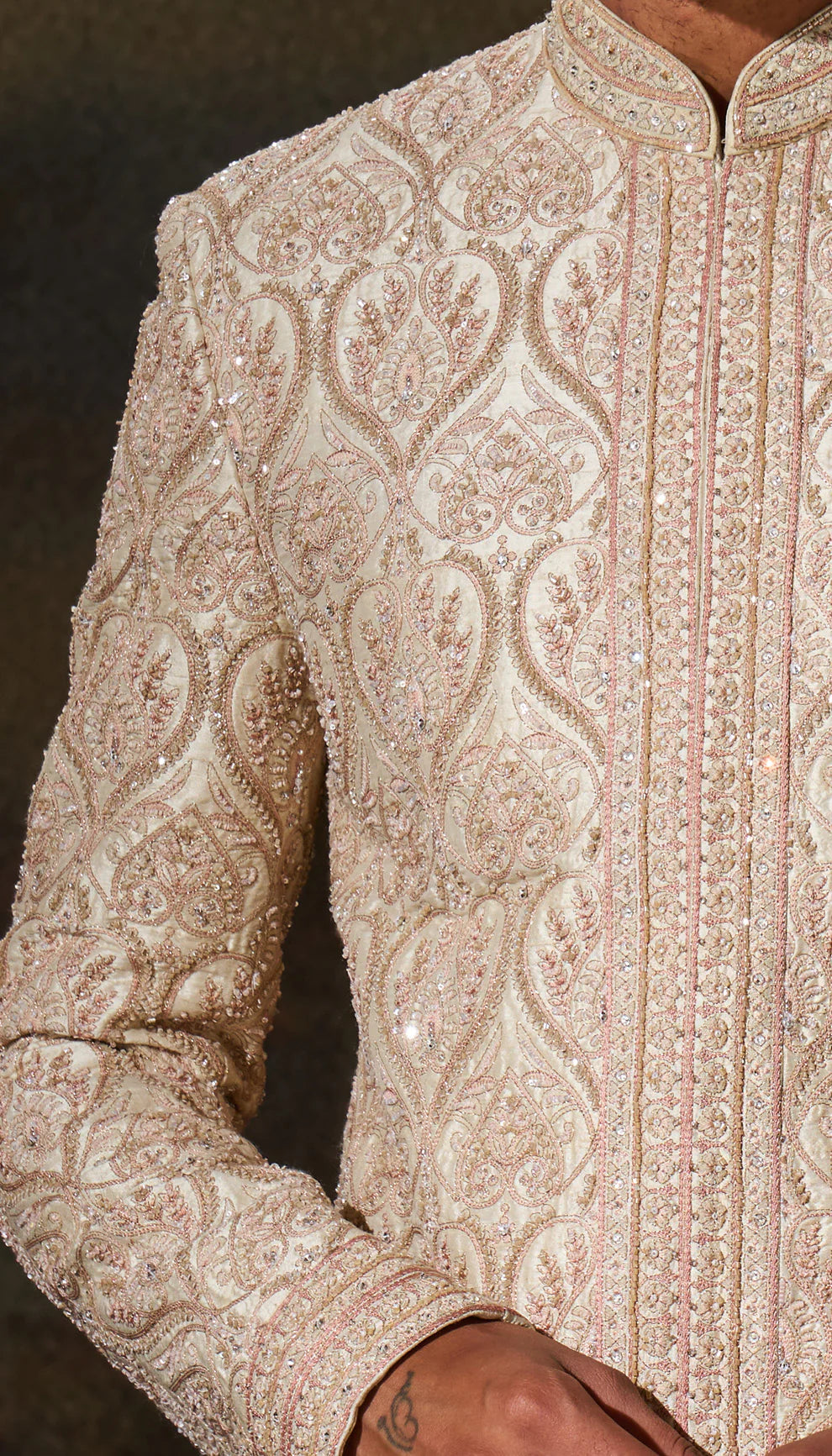 A shell pink raw silk sherwani with elaborate resham and glass bead embroidery. This is