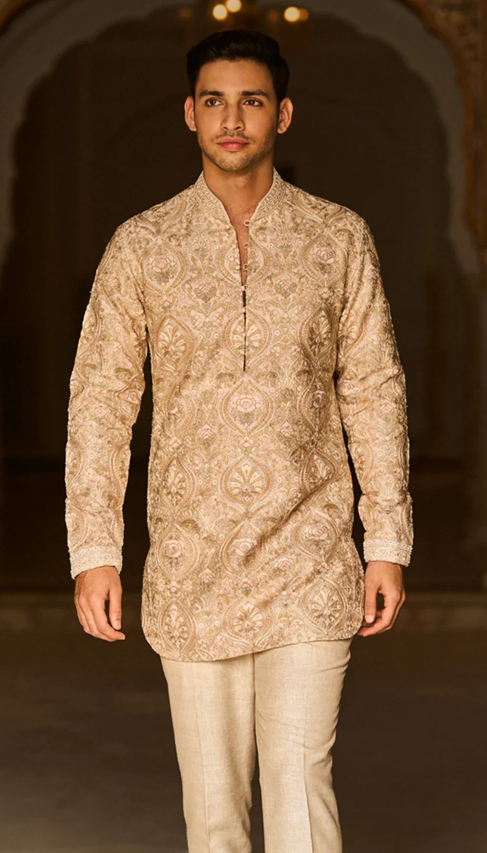A Shell pink thick organza kurta inspired by baroque architecture paired with cream matka silk trouser.