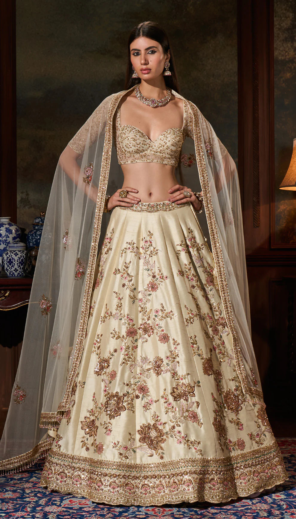 A vintage ivory raw silk lehenga with intricate zardozi embroidery. The tropical flowers are