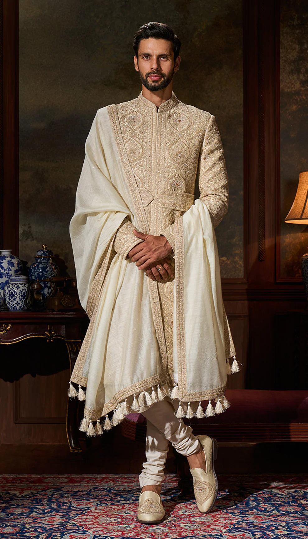 A vintage ivory sherwani with intricate resham embroidery, highlighted with tonal glass