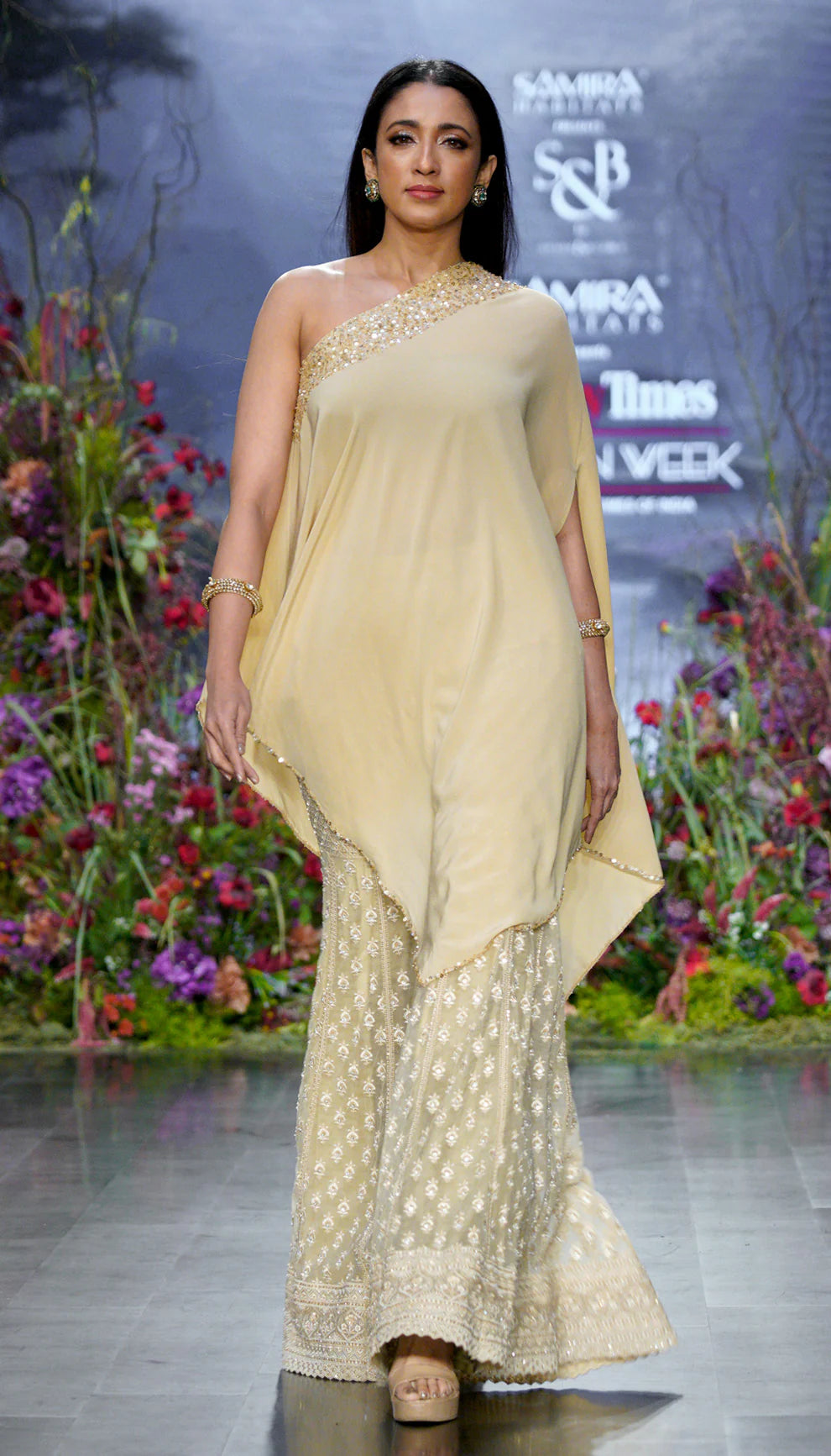 A delicate tulle sharara in almond beige with tone on tone Resham embroidery, accentuated with glass beads, sequins and crystals. This is worn with a crepe silk one shouldered kurti.