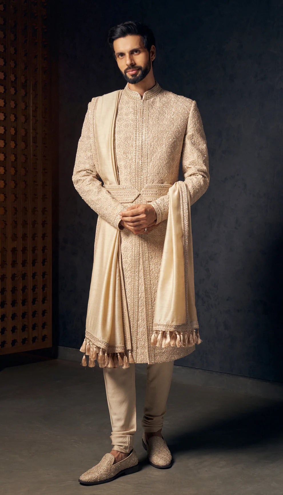 An almond beige raw silk sherwani with delicate tone-on-tone embroidery, inspired by the stucco walls of Gujarat’s old havelis. The resham embroidery is enhanced with glass beads and sequins to add a soft, elegant shimmer to this timeless look.