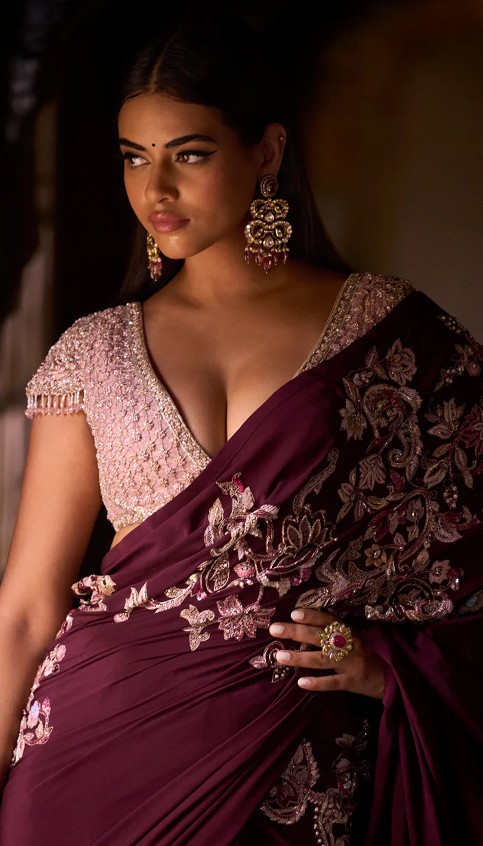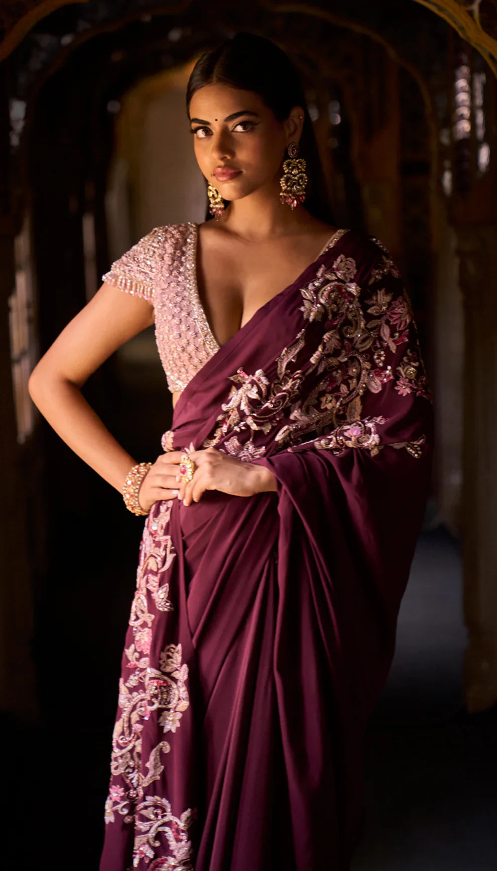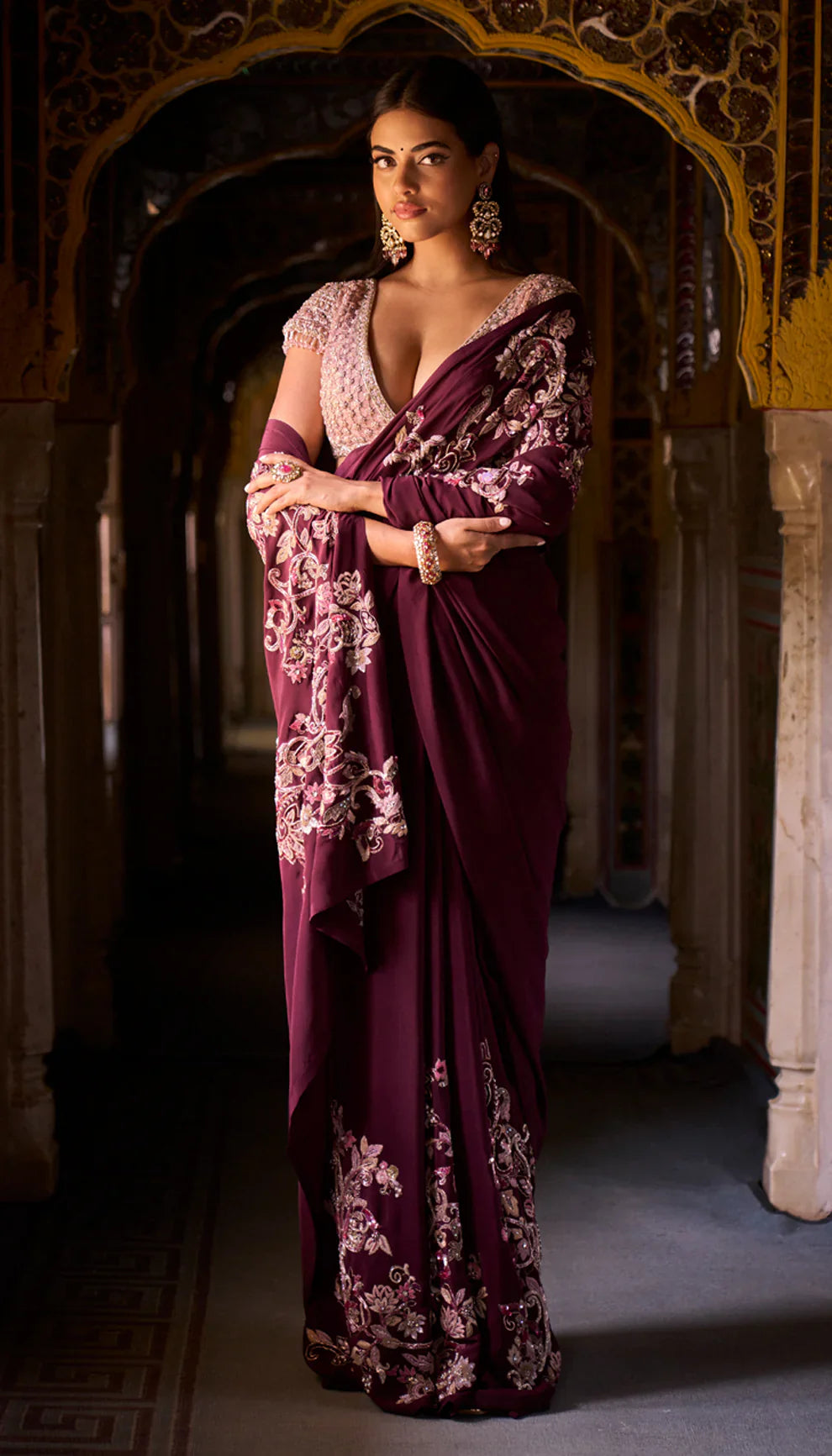 An aubergine crepe silk saree with intricately embroidered floral paisley motifs.