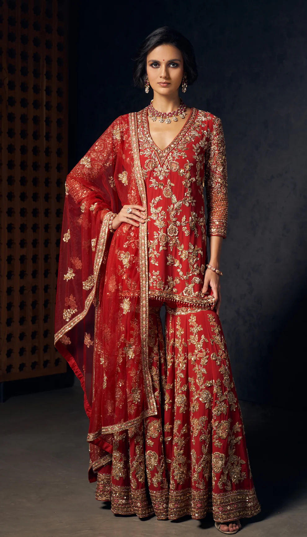 An Exquisite vermilion red Sharara, featuring intricate vintage gold zardozi embroidery, inspired by the ornate jaalis of historic havelis. This is paired with a flowy tulle dupatta.