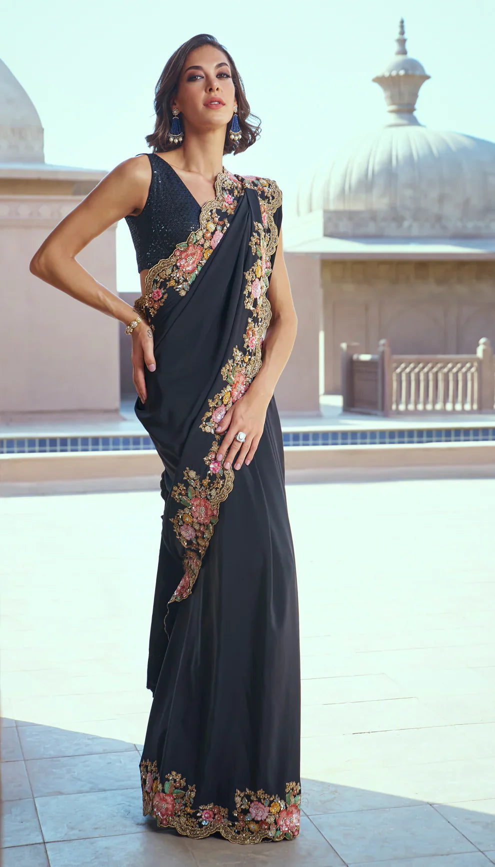 A black antique gold zardozi and resham border crepe silk saree paired with a matching raw silk blouse.