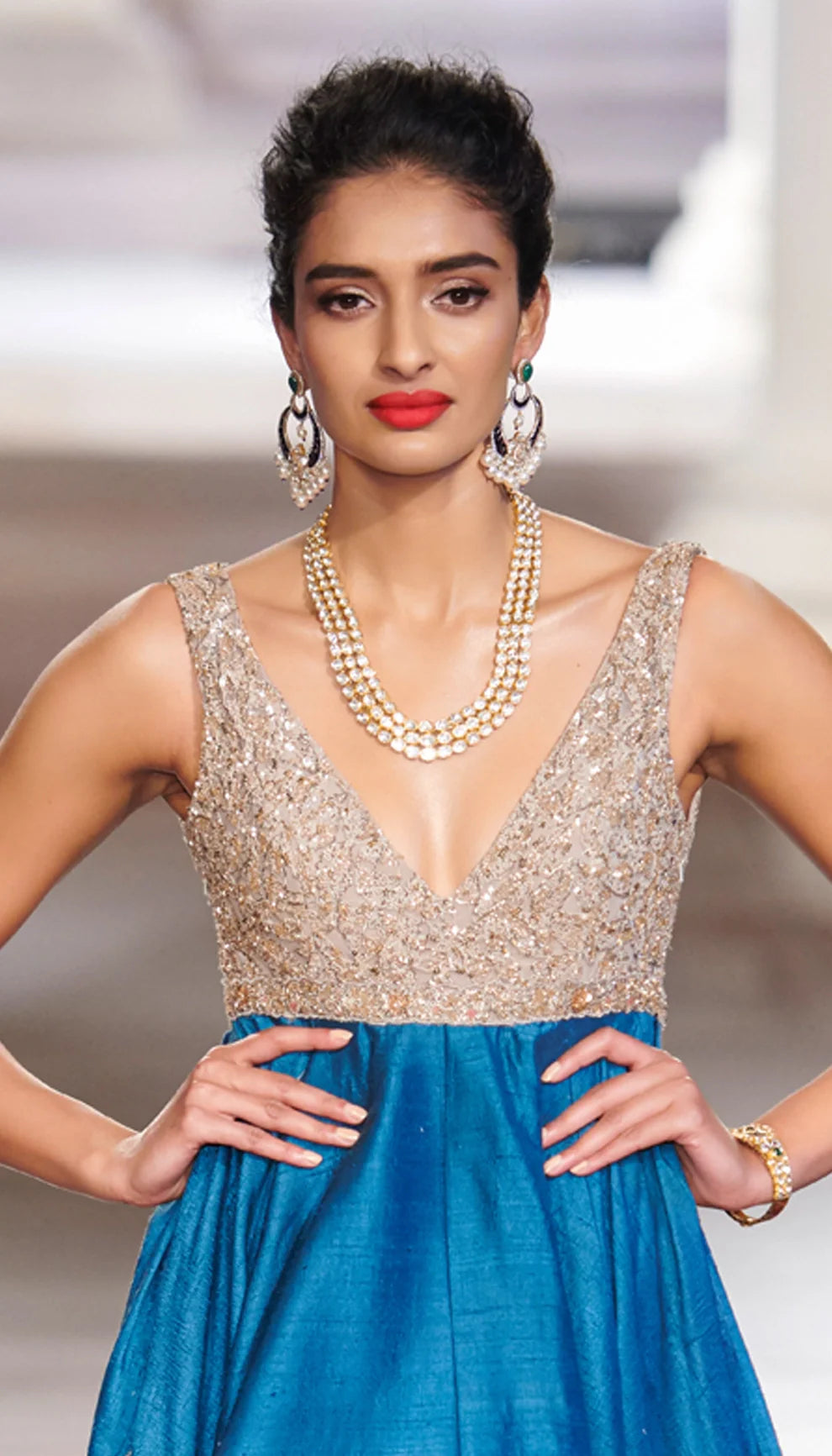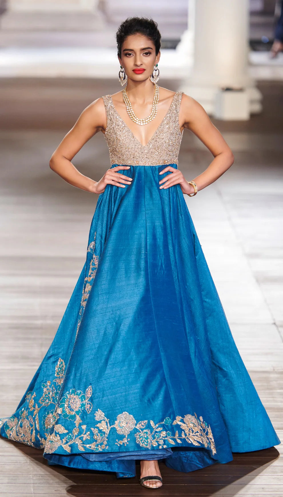 Blue Ball Gown with Floral Hem and Aari-Pita Embroidery