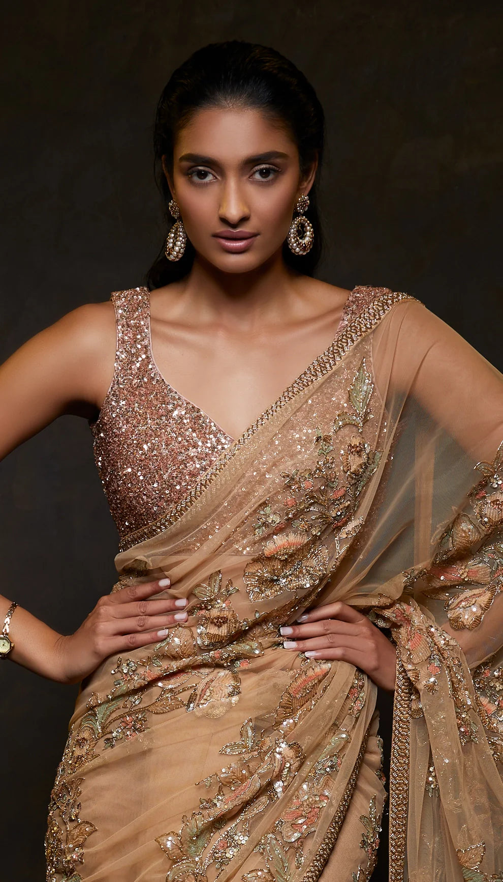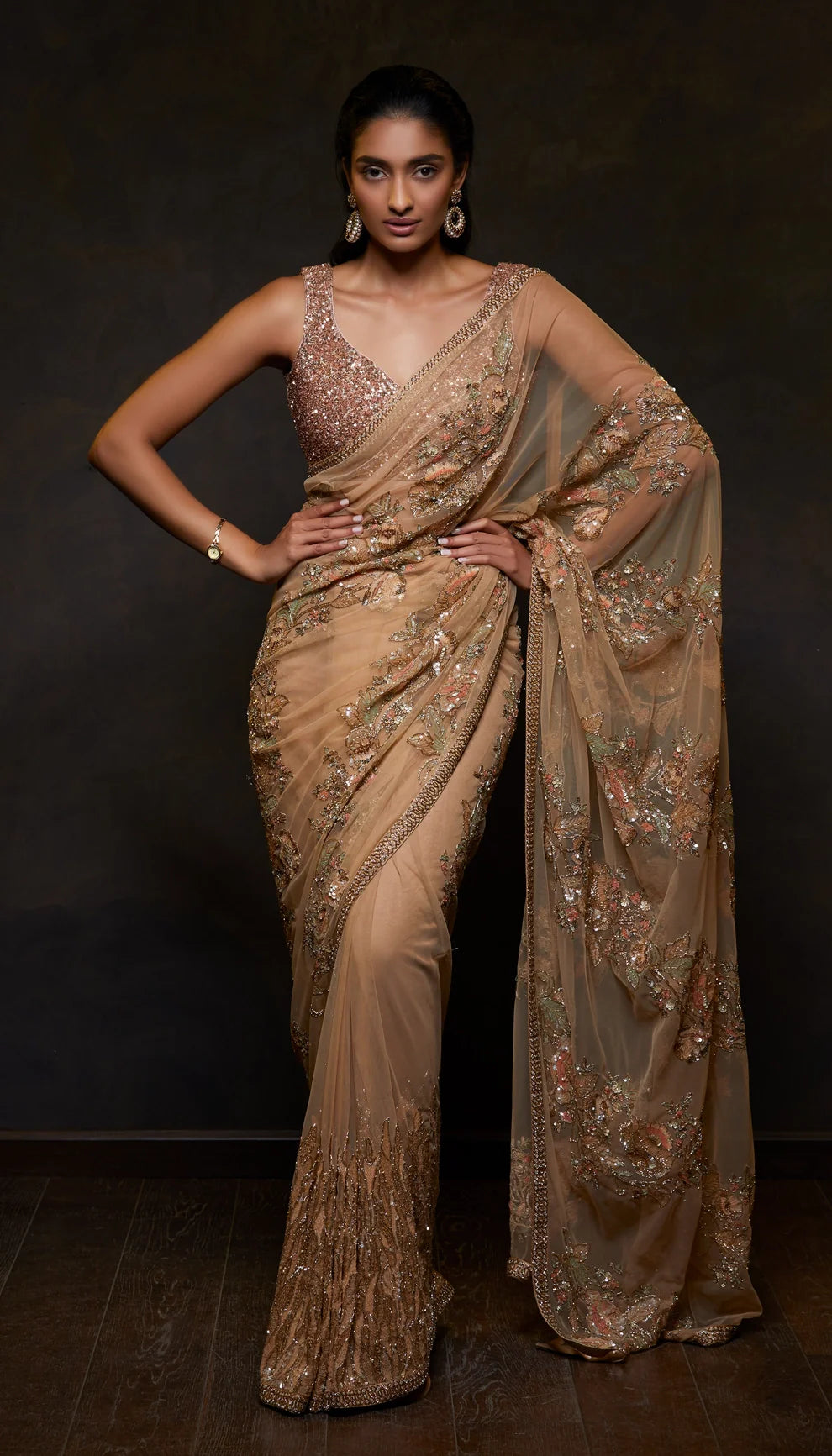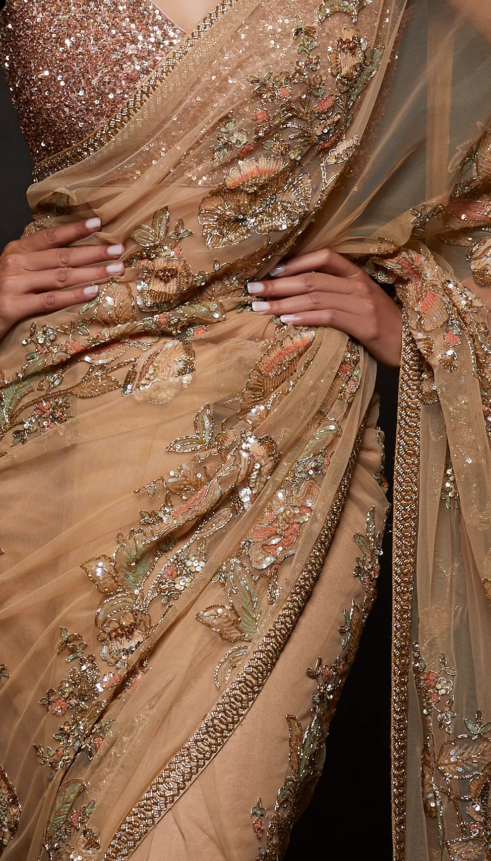 A gorgeous champagne beige saree with a blush pink zardozi border, encrusted in