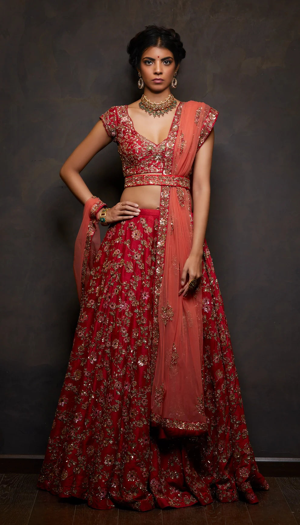A classic red lehenga with a rich volume of raw silk fabric and all-over floral embroidery done in beads, pitta and watery sequins, paired with a raw silk blouse and a contrasting tulle dupatta.
