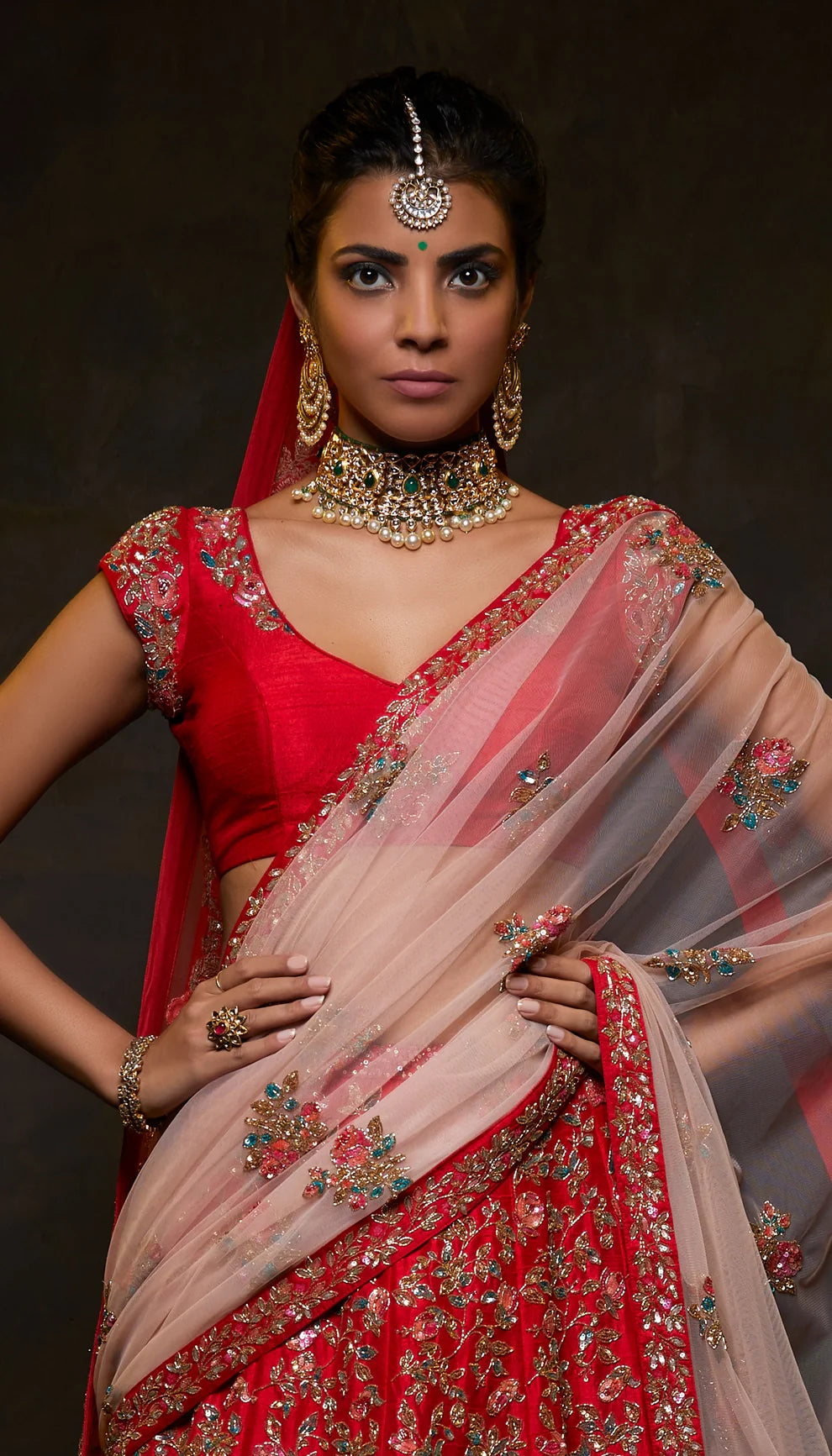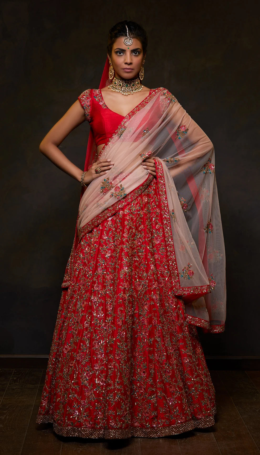 Lehenga, paired with an encrusted blouse and a contrasting tulle dupatta.