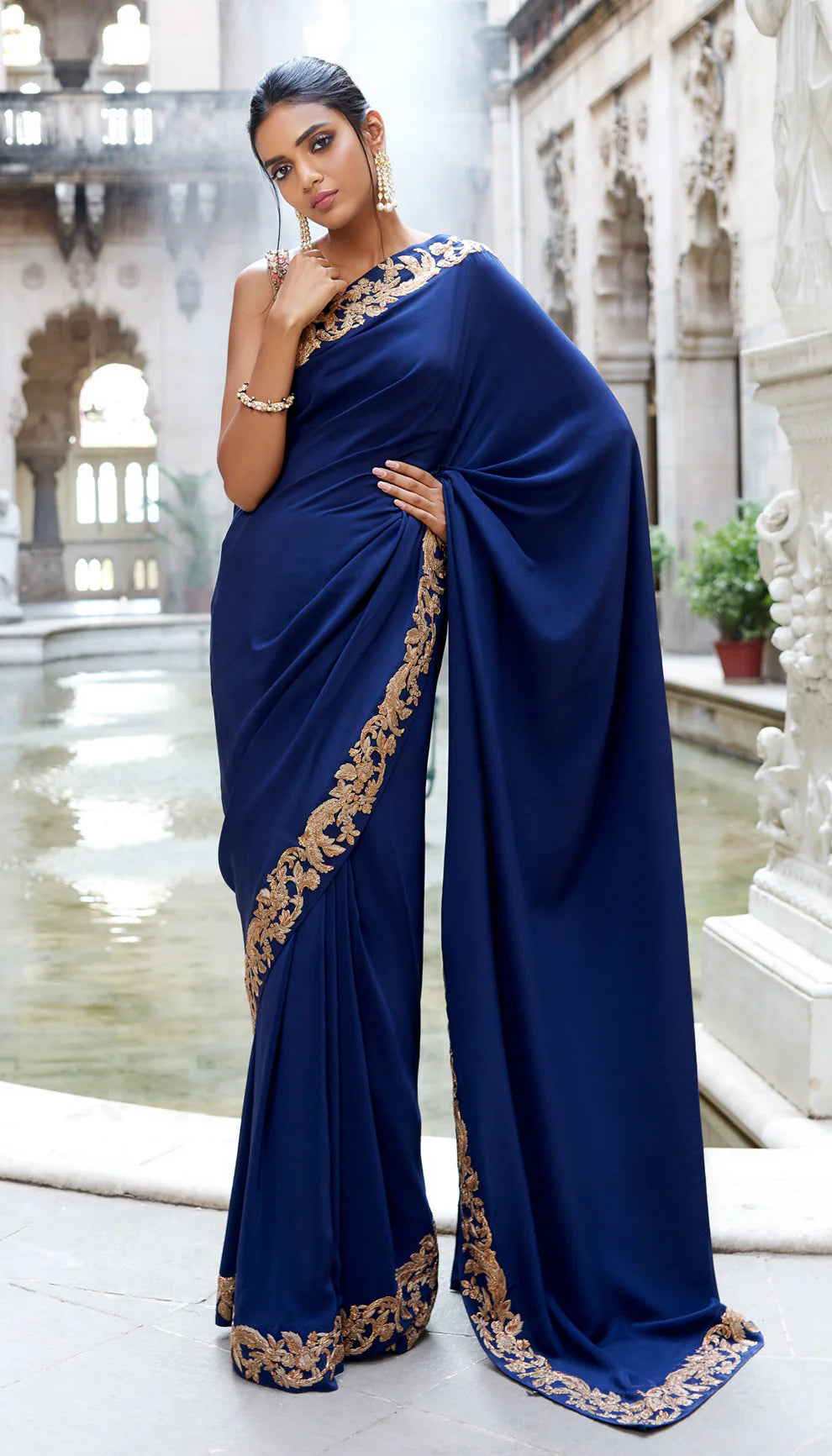 Deep Royal Blue Crepe Sari with Antique Gold Peeta Border