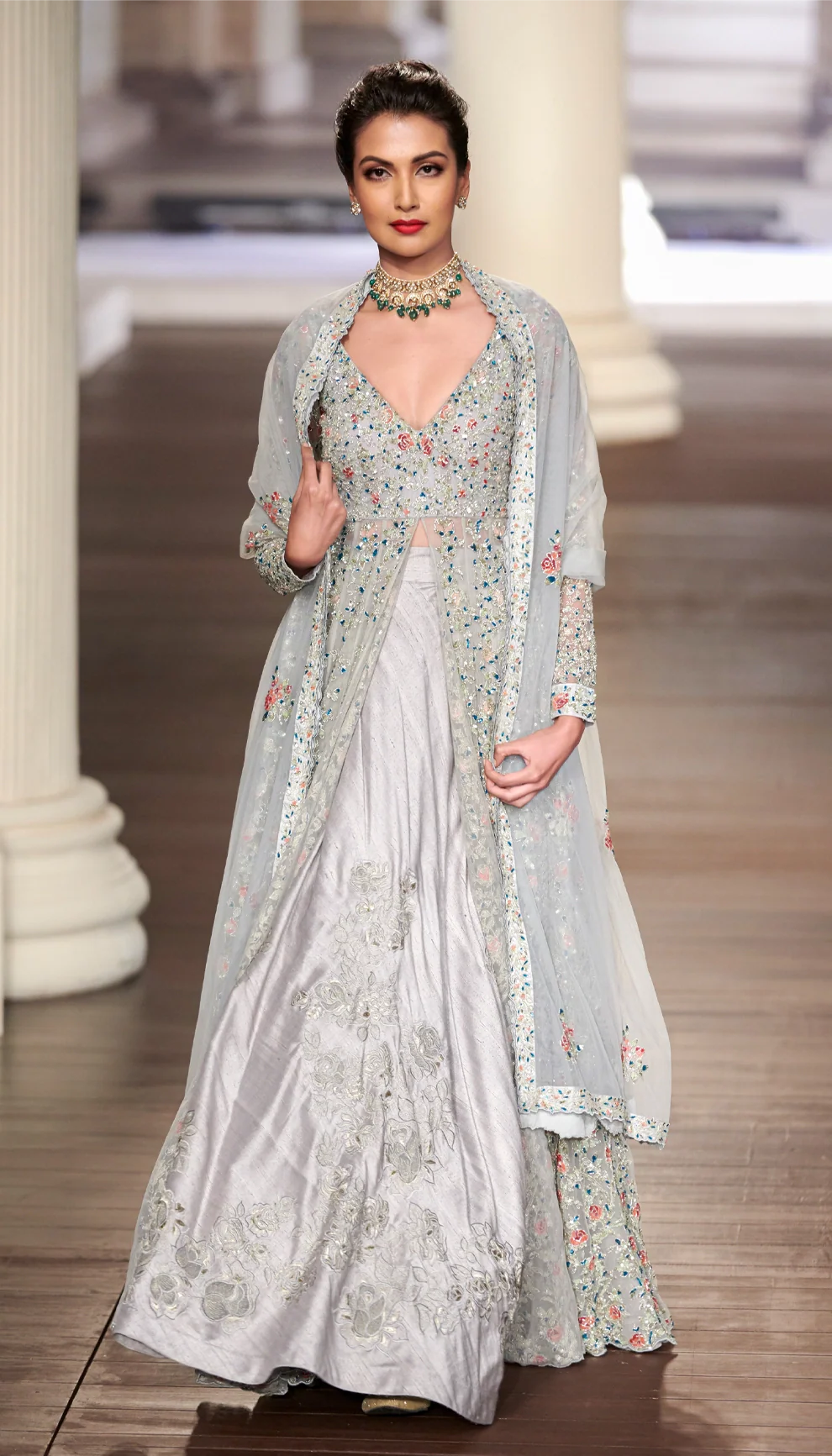 Dusty Blue Tulle Jacket with English Rose Embroidery Over Moon Grey Lehenga