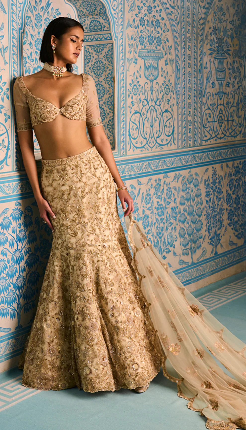 Champagne tulle fish tail lehenga with floating flower tonal embroidery. It is paired with a