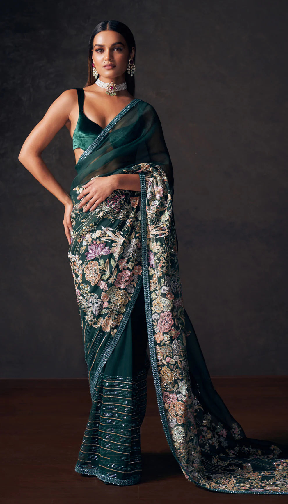 A forest green organza saree with beautiful scenery embroidered using varied hand-embroidered stitches. This is teamed with a velvet bustier.