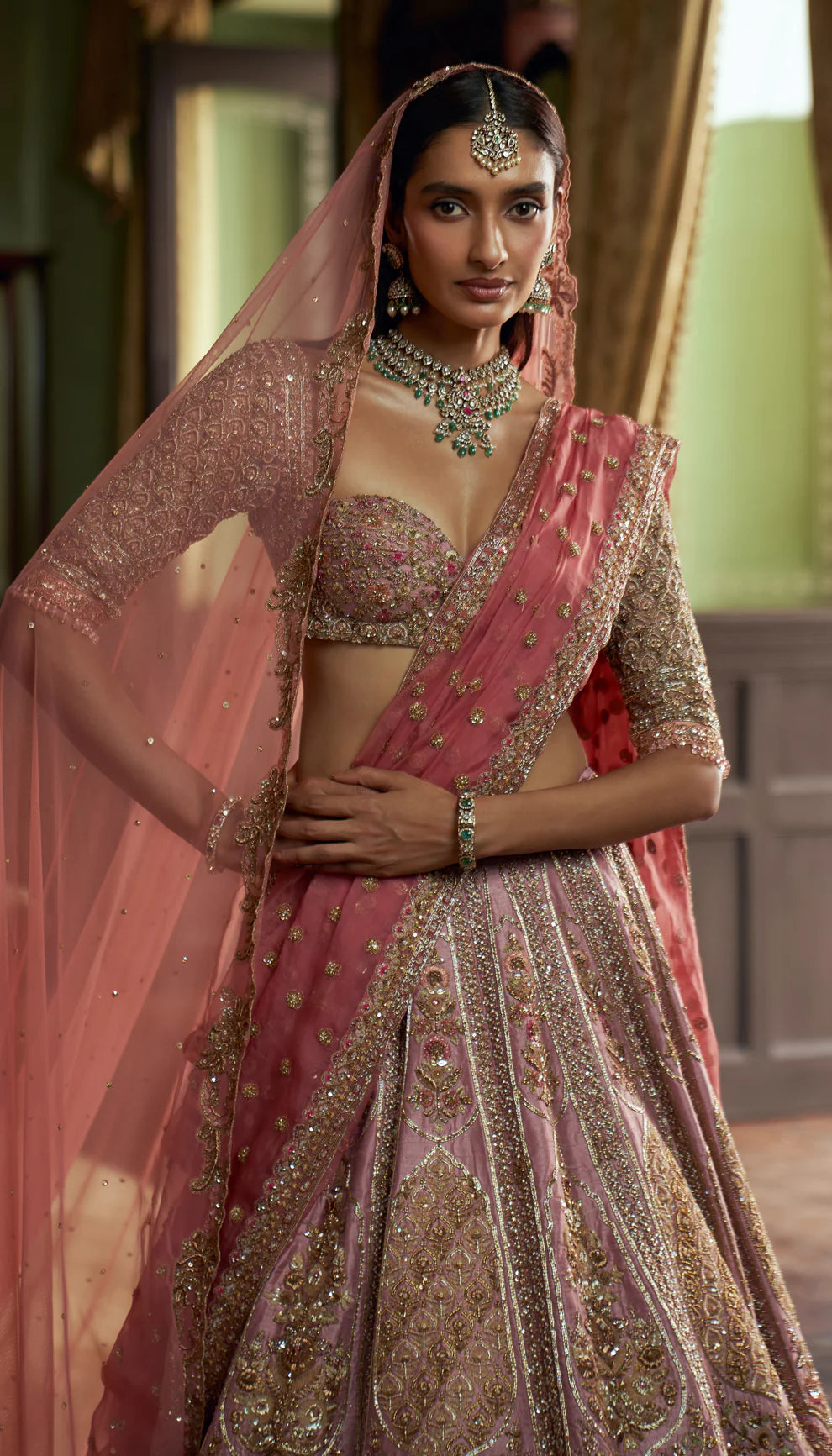 An elegant rose pink Raw silk lehenga with finely detailed decorative architectural patterns, embroidered in intricate zardozi and aari embroidery, worn with a sheer tulle choli and dupatta.