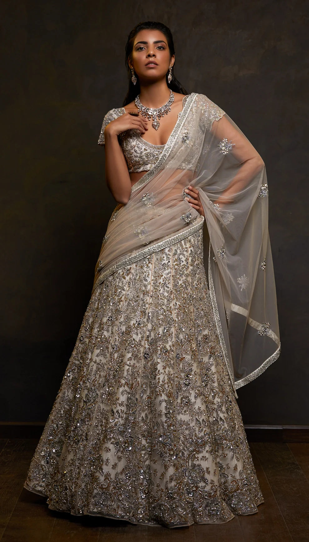 Classic ivory tulle lehenga with layers of silver and dull gold sequins hand-embroidered in the traditional aari technique paired with a blouse and a dupatta.