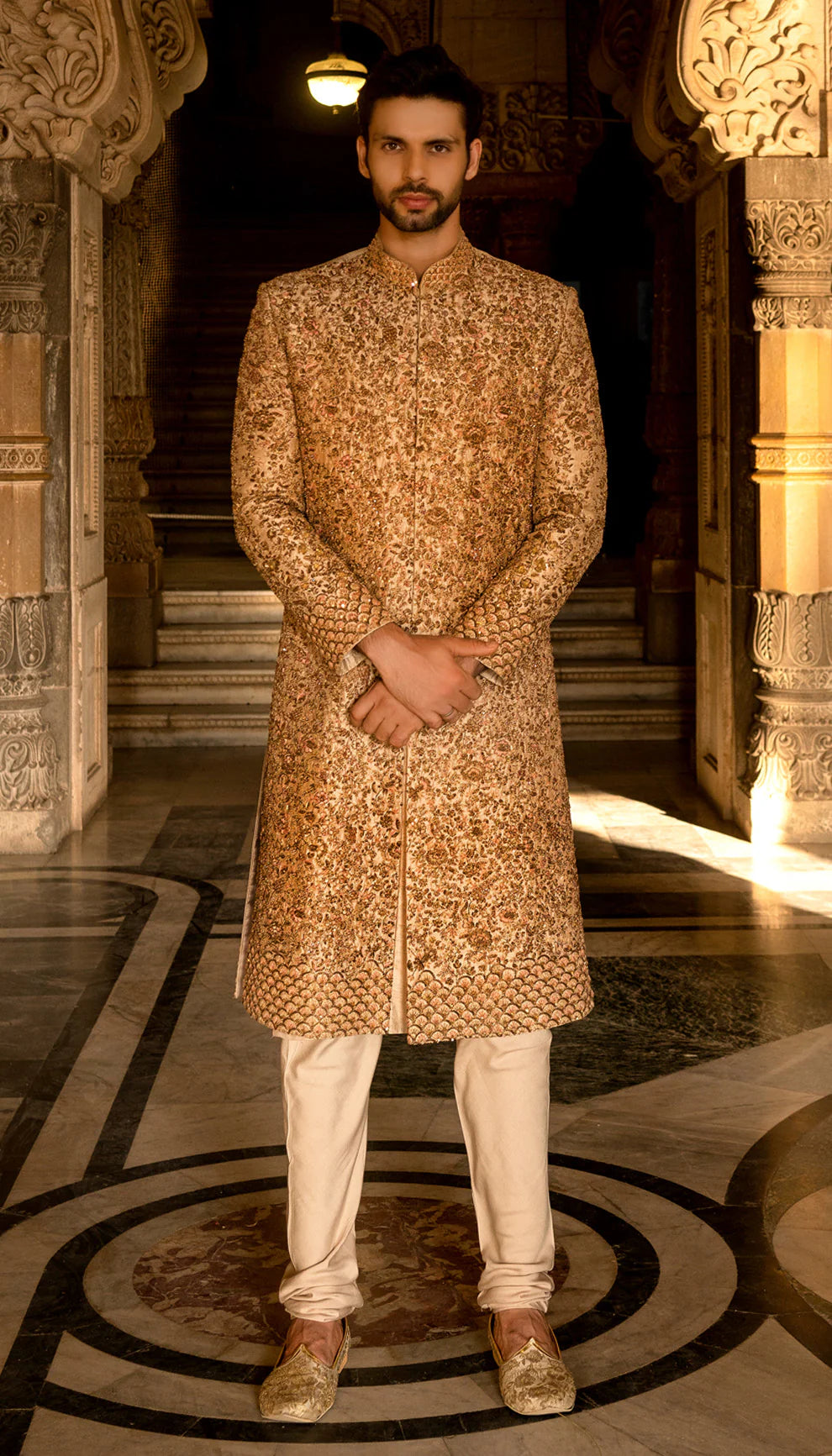 Muted Ivory Raw Silk Sherwani with Aari & Zardosi Embroidery in Garden Roses